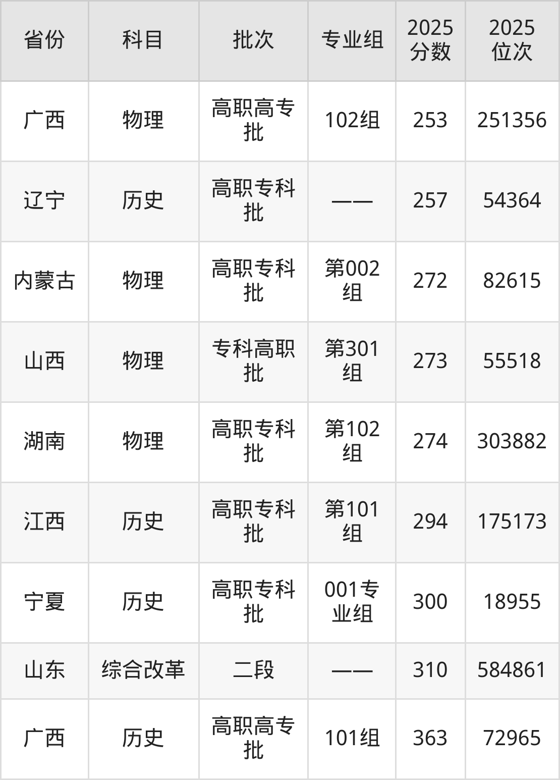 最高录取分数线是363分,对应位次是72965名,招生地区为广西。