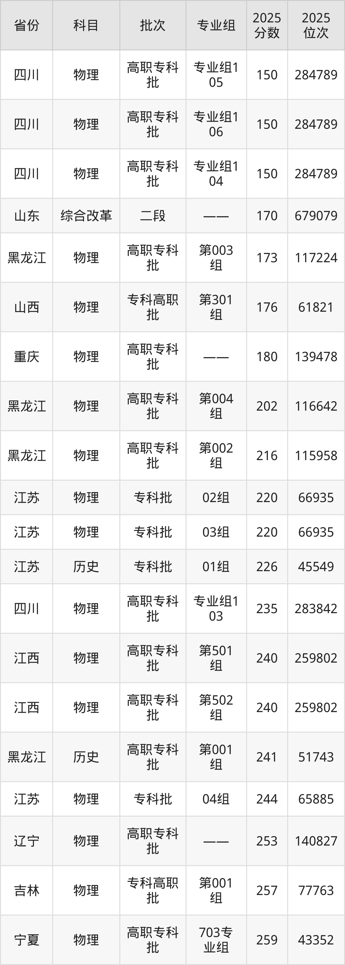 最低录取分数线是150分,对应位次是284789名,招生地区为四川;