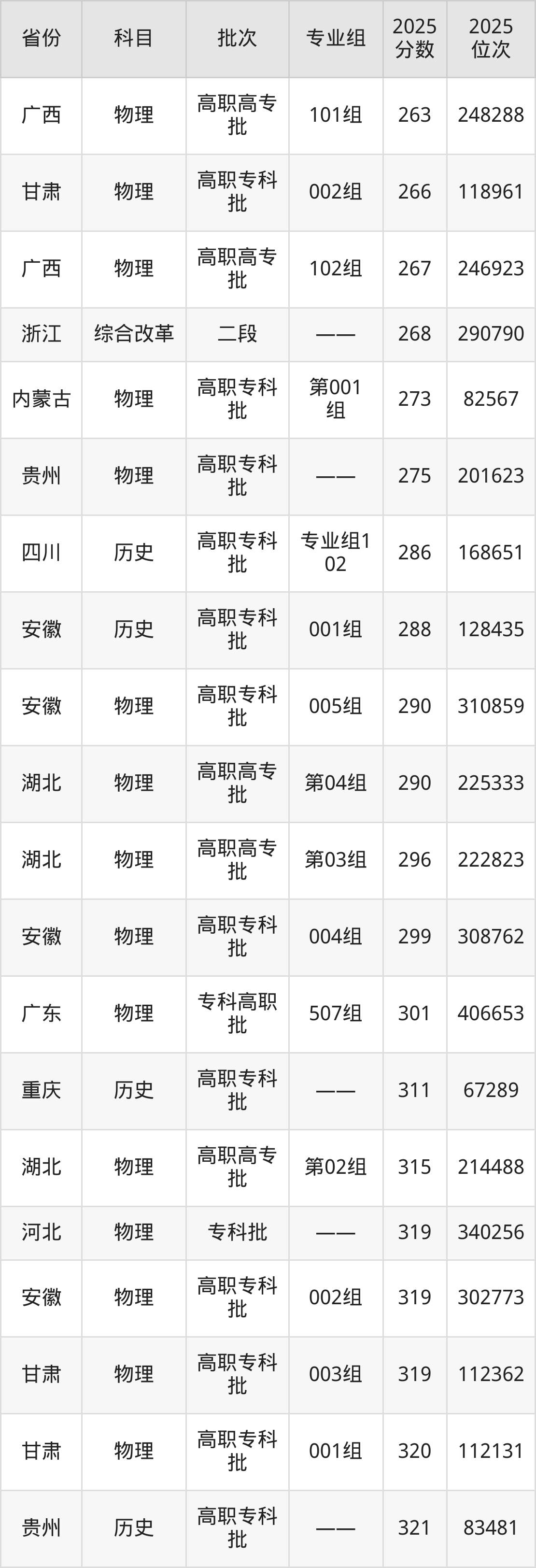 2025年西藏职业技术学院在各省普通批录取分数线一览表: