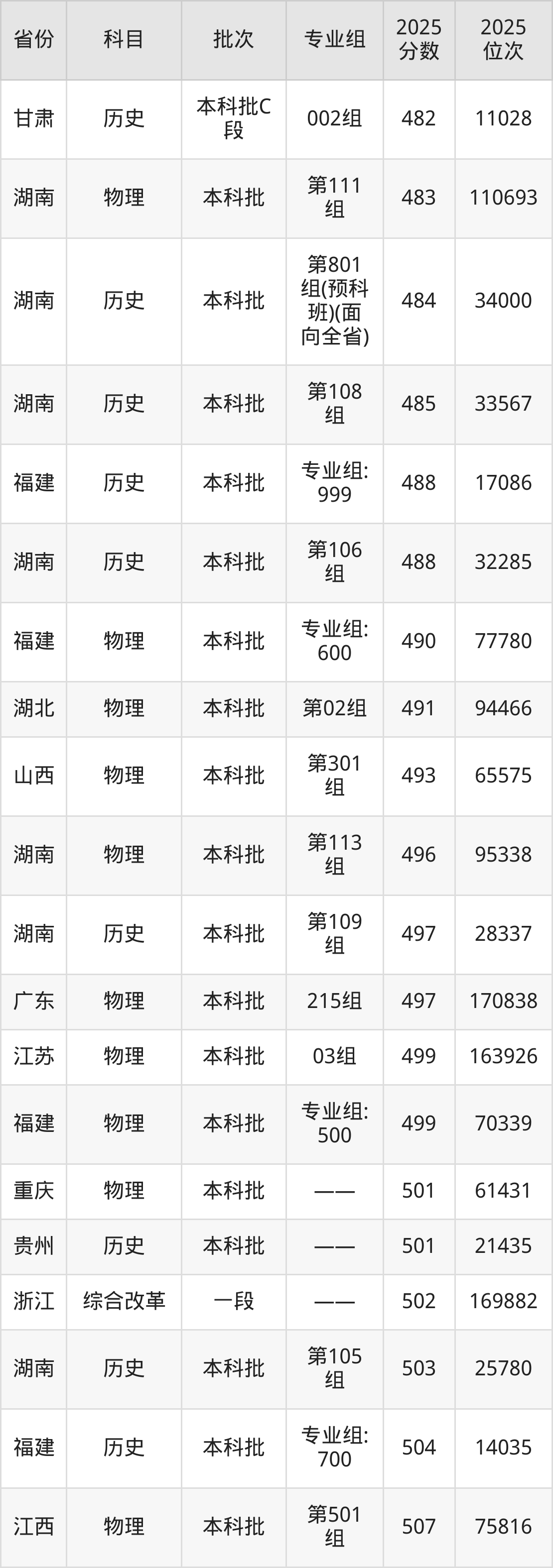 2025年怀化学院在各省普通批录取分数线一览表: