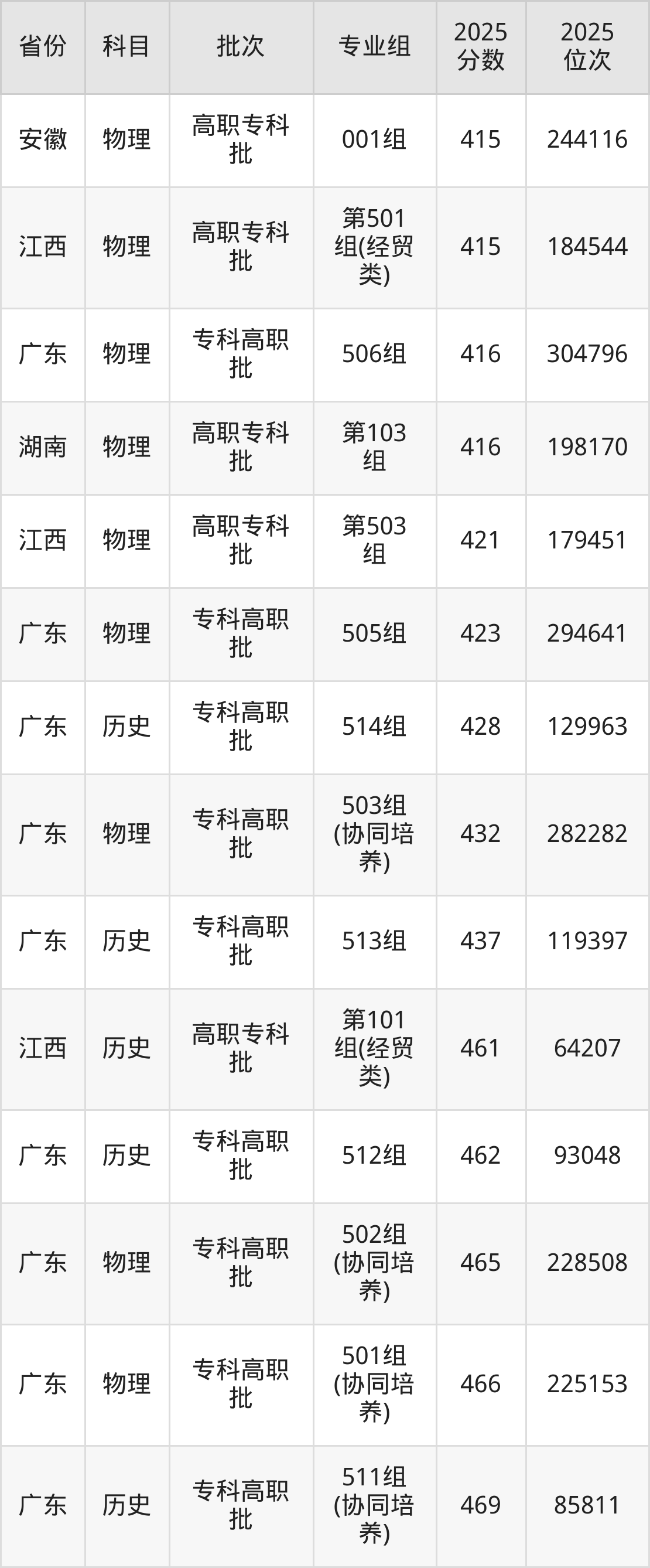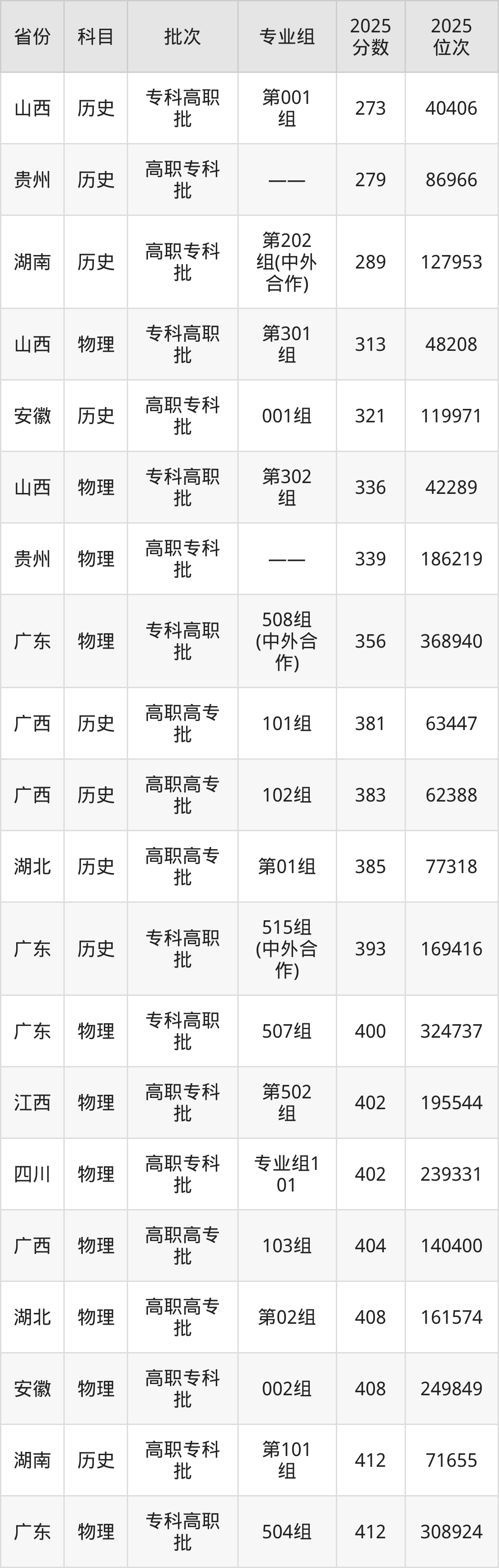 2025年中山职业技术学院在各省普通批录取分数线一览表: