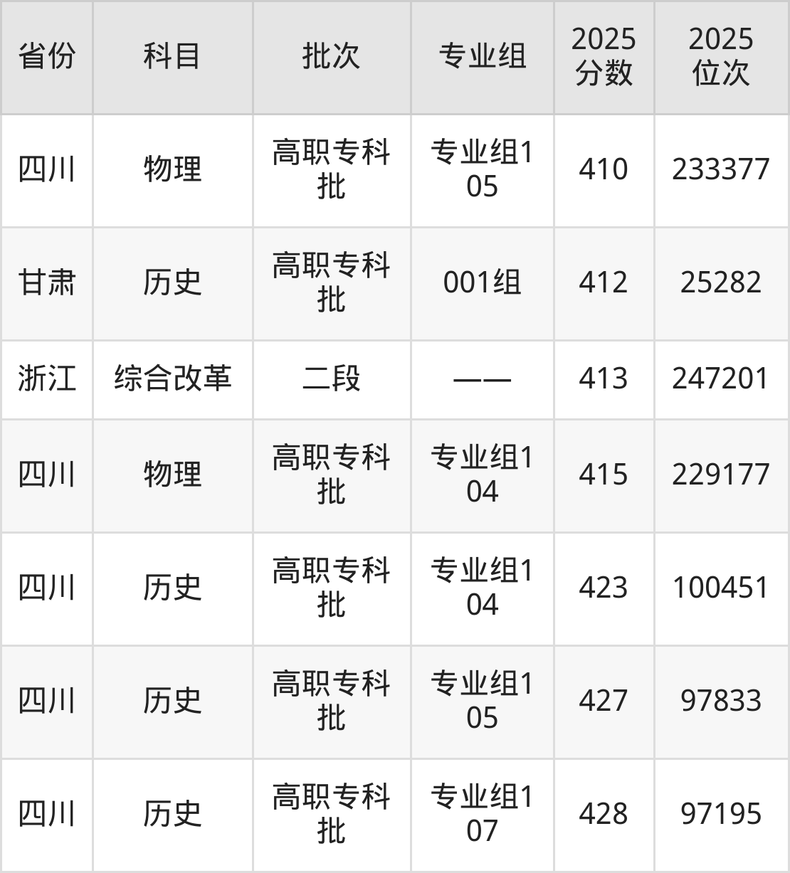 2025年南充职业技术学院在各省普通批录取分数线一览表: