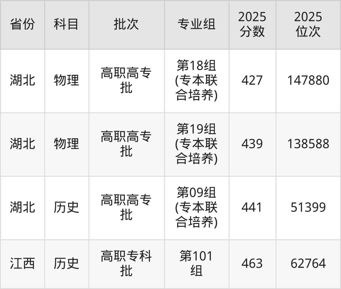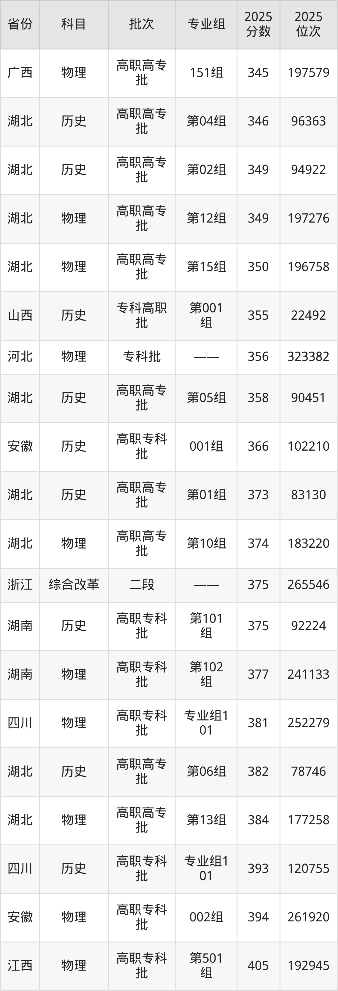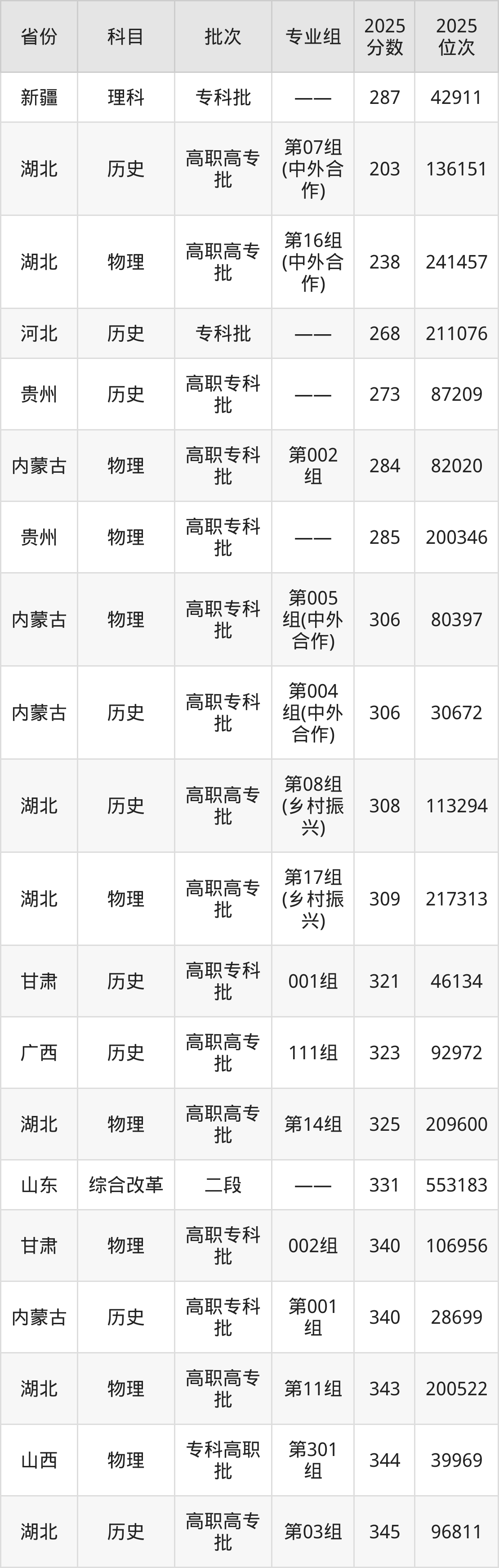 2025年湖北工业职业技术学院在各省普通批录取分数线一览表: