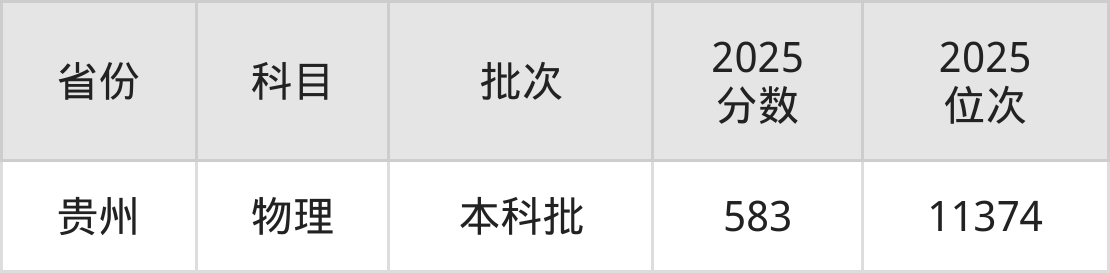 最低录取分数线是583分,对应位次是11374名,招生地区为贵州。