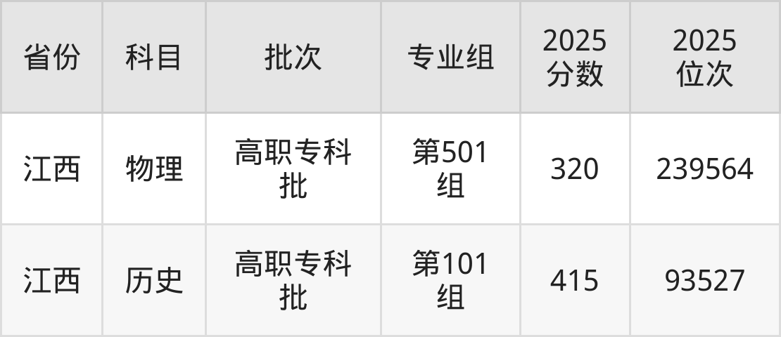 最低录取分数线是320分,对应位次是239564名,招生地区为江西。