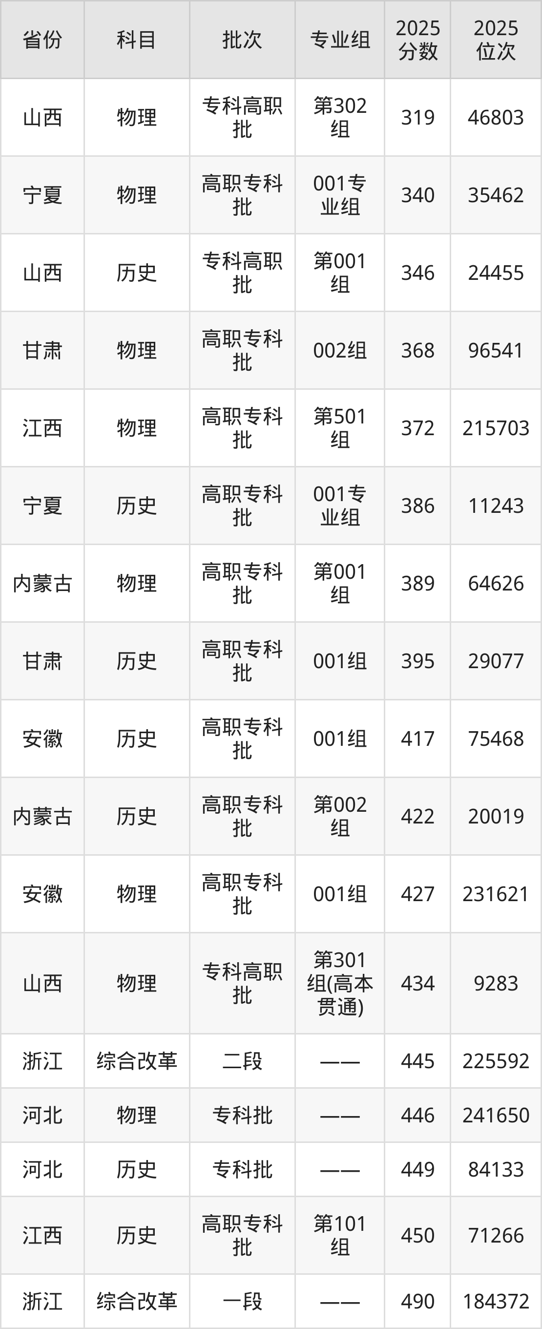 2025年山西药科职业学院在各省普通批录取分数线一览表: