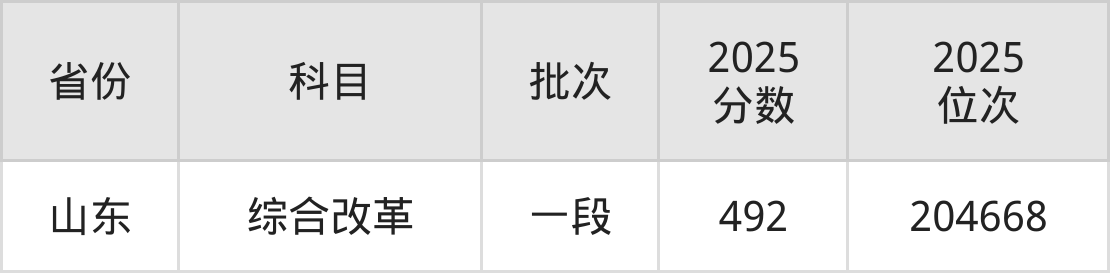 最低录取分数线是492分,对应位次是204668名,招生地区为山东。