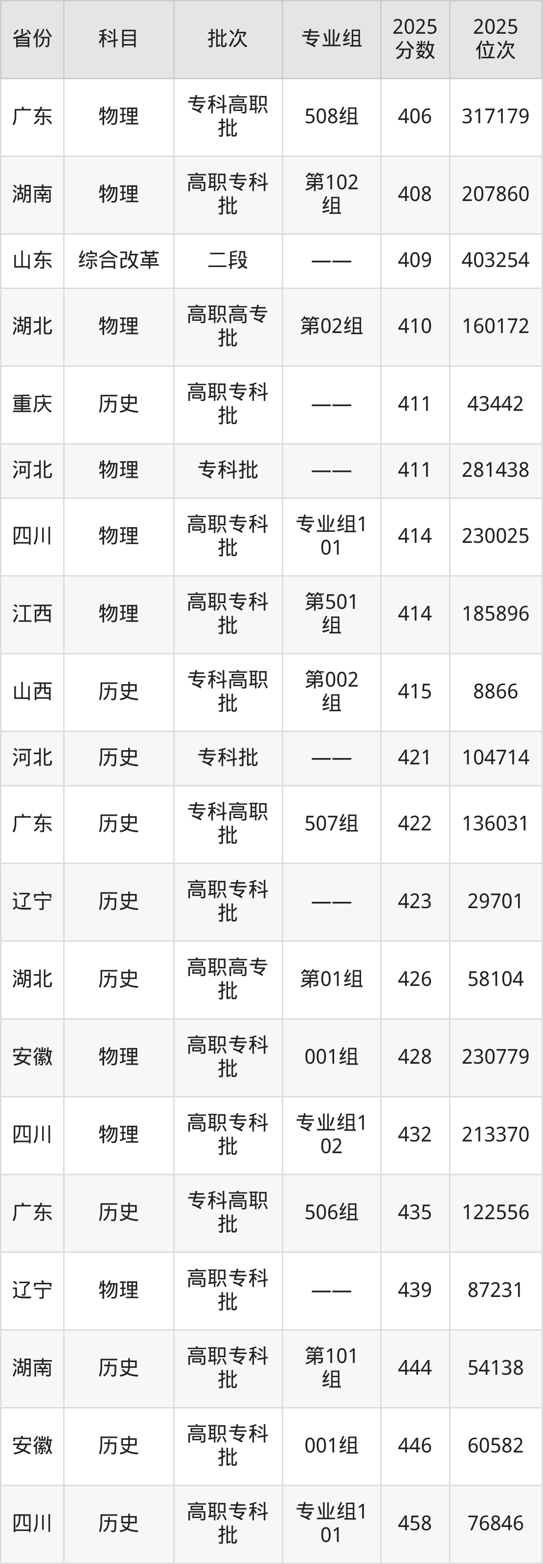 最低录取分数线是409分,对应位次是403254名,招生地区为山东。