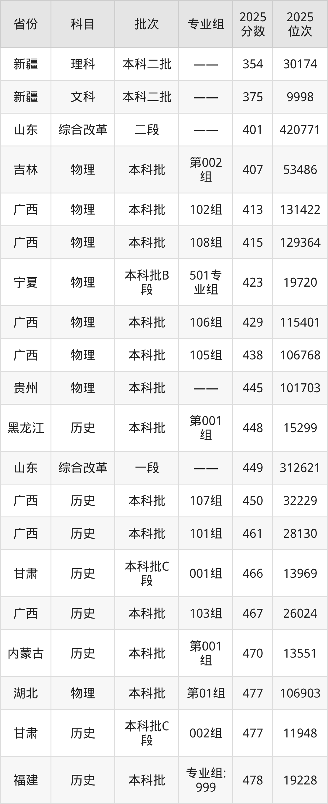 最低录取分数线是401分,对应位次是420771名,招生地区为山东;