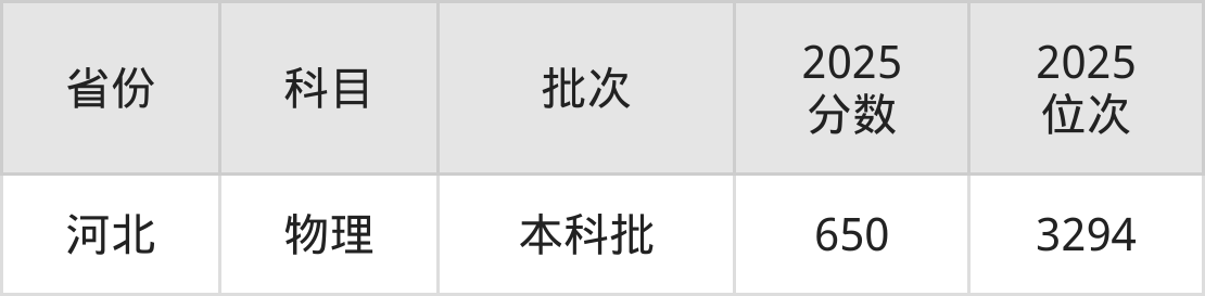 最低录取分数线是650分,对应位次是3294名,招生地区为河北。