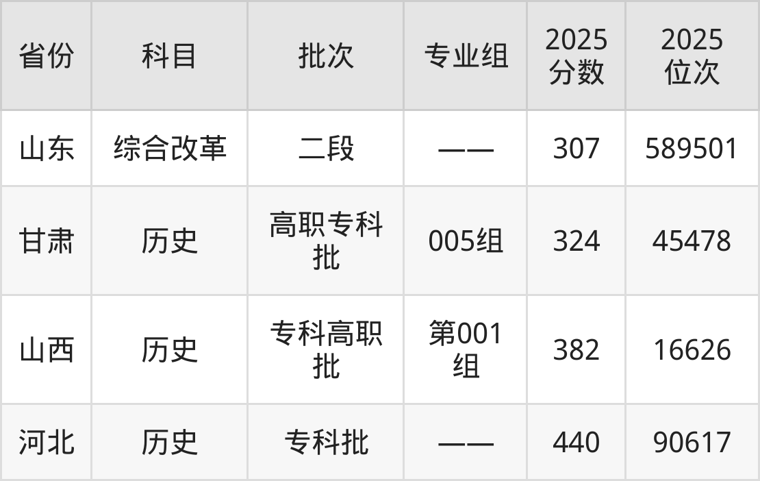 2025年山东特殊教育职业学院在各省历史类的录取分数线位于324分-440分之间。