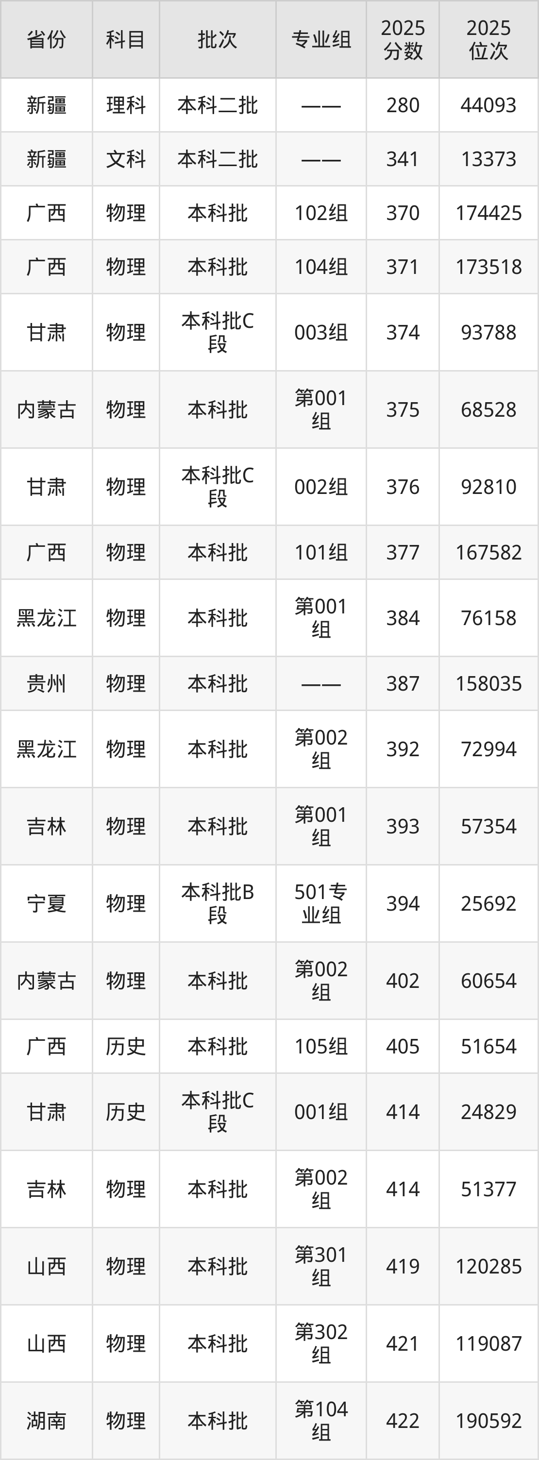 最低录取分数线是280分,对应位次是44093名,招生地区为新疆;