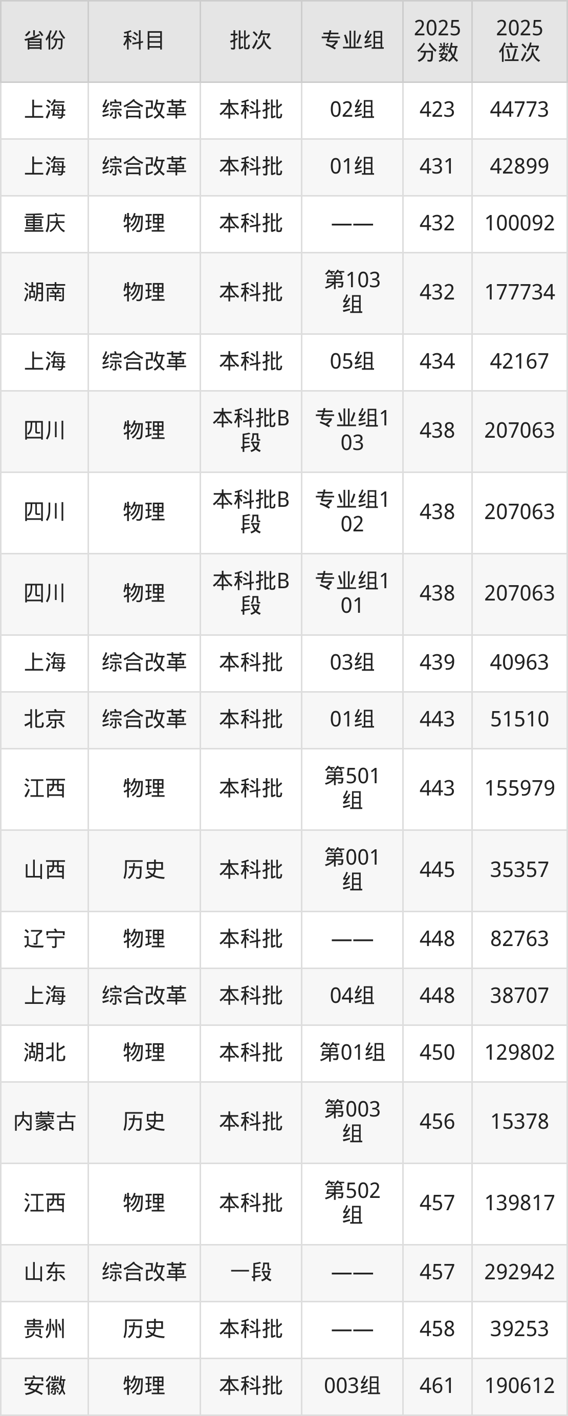 最低录取分数线是423分,对应位次是44773名,招生地区为上海;