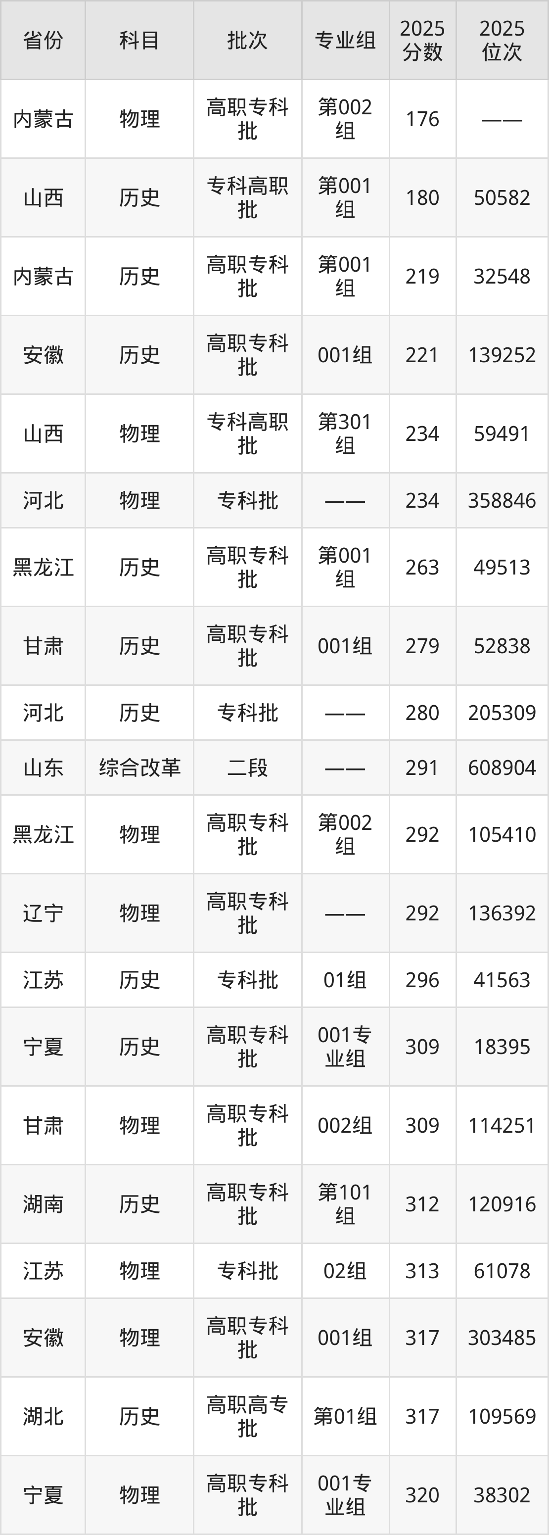 2025年北京培黎职业学院在各省普通批录取分数线一览表: