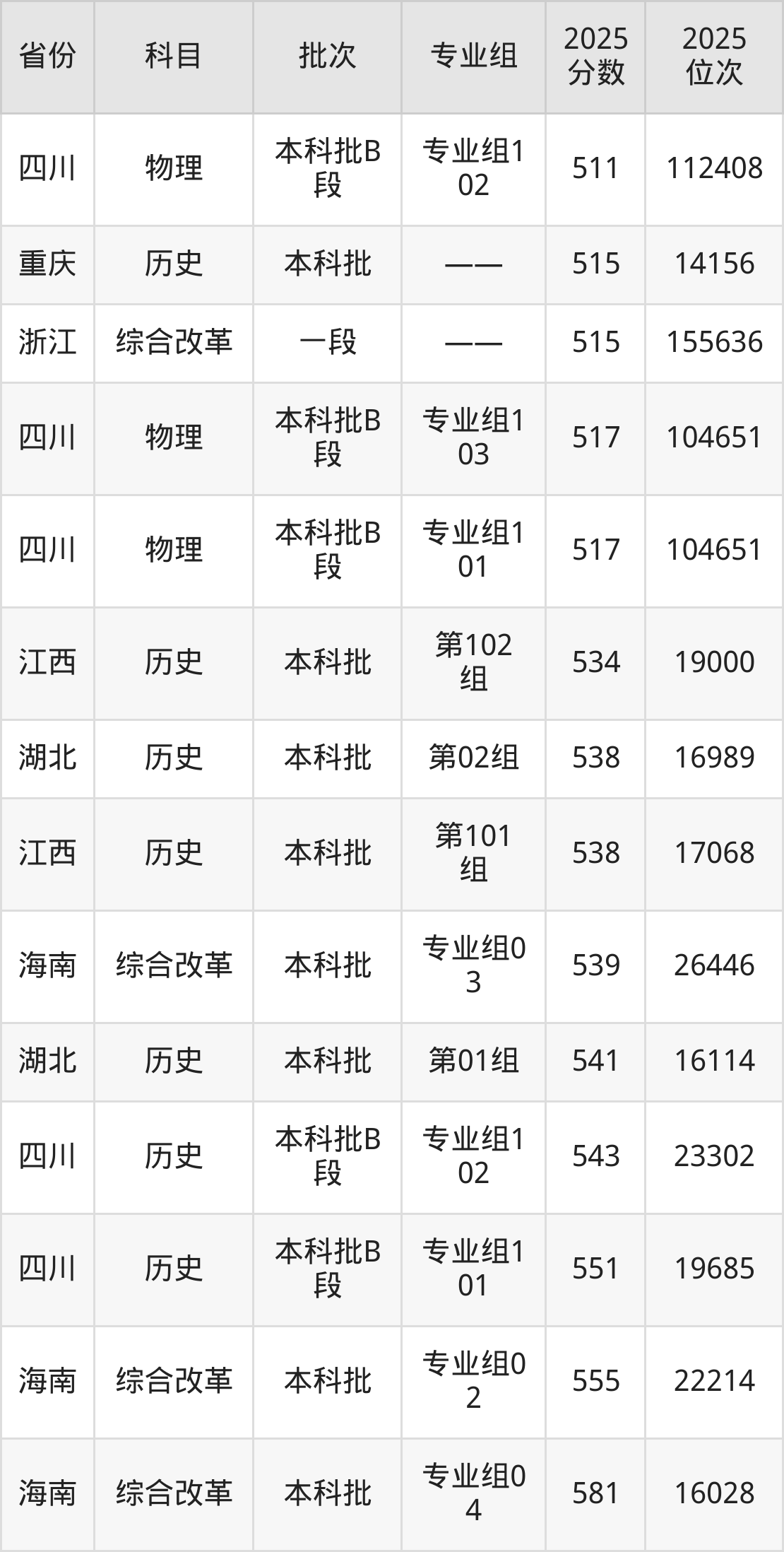 最高录取分数线是551分,对应位次是19685名,招生地区为四川。