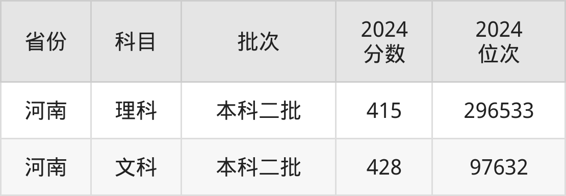 最低录取分数线是415分,对应位次是296533名,招生地区为河南。