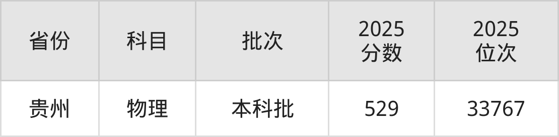 最低录取分数线是529分,对应位次是33767名,招生地区为贵州。