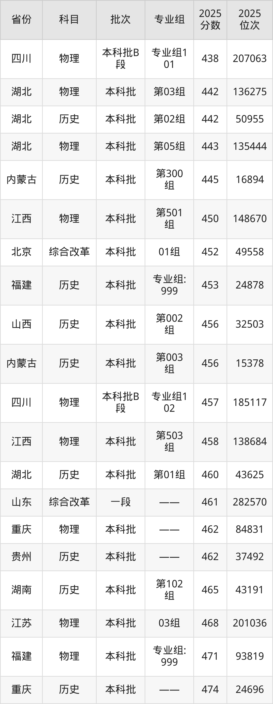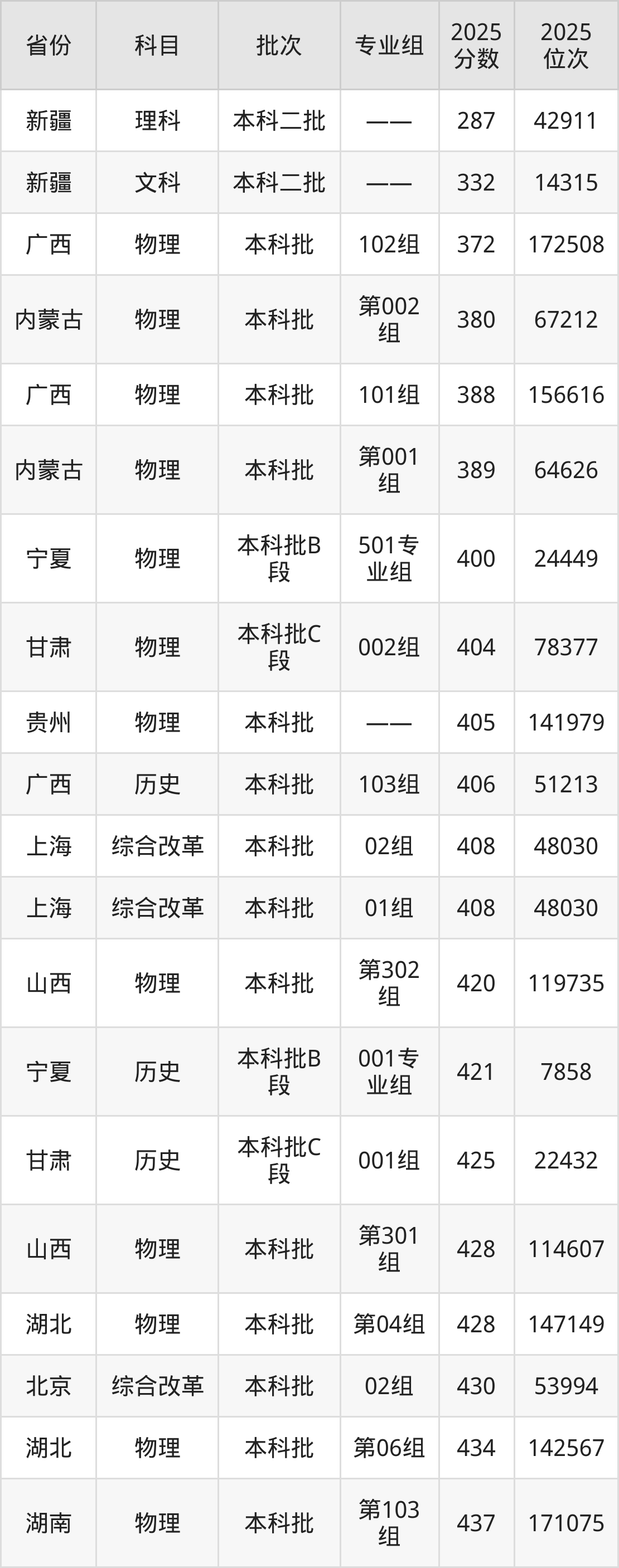 最低录取分数线是287分,对应位次是42911名,招生地区为新疆;