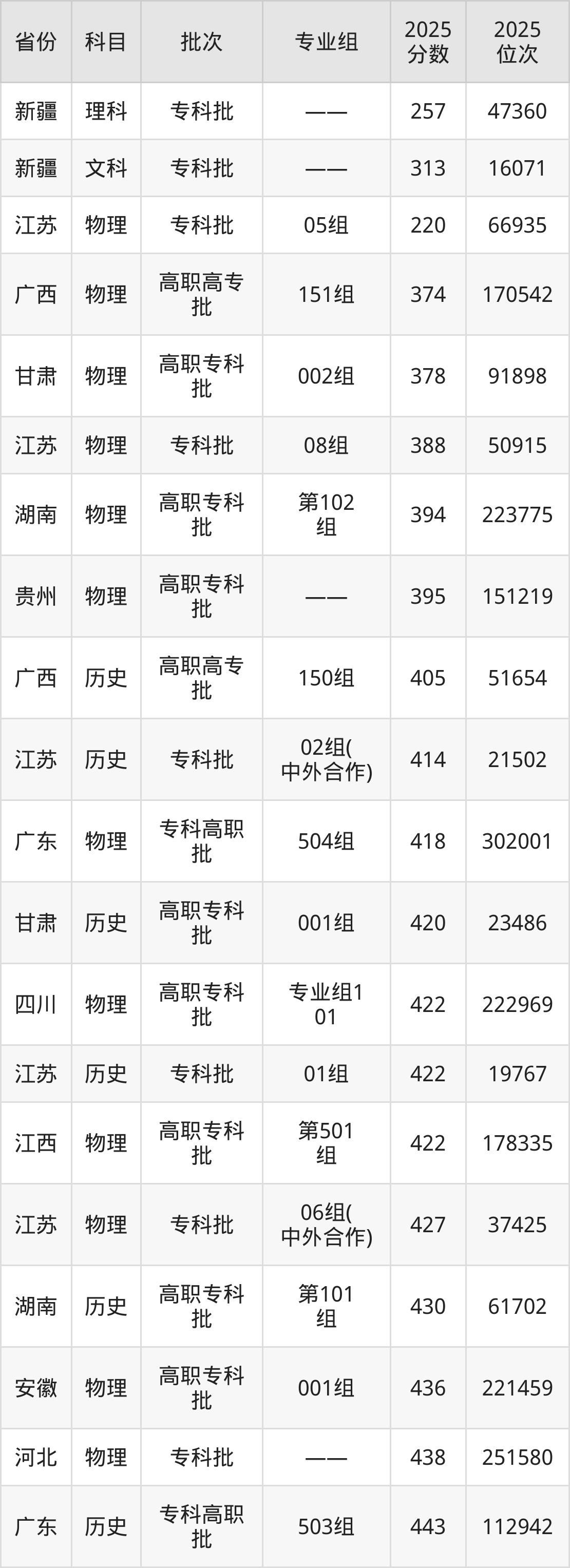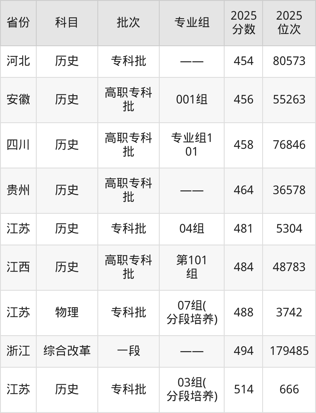 2025年江苏护理职业学院在各省普通批录取分数线一览表: