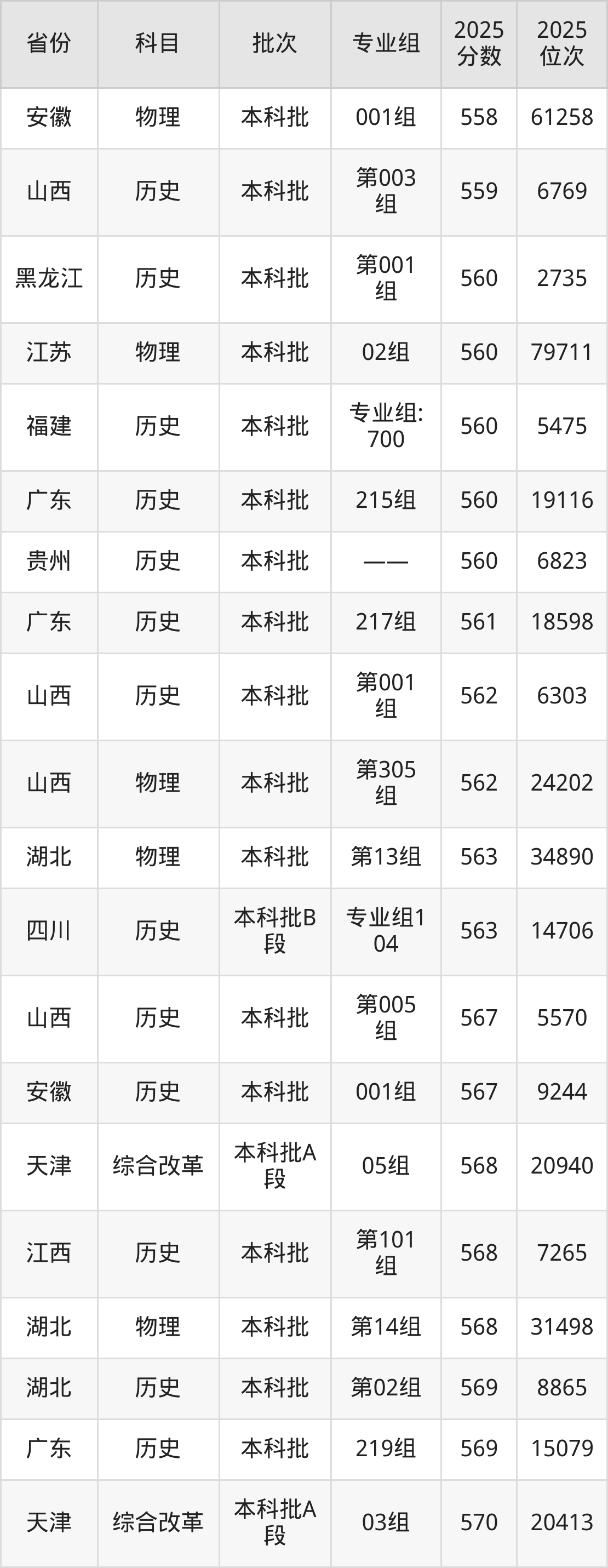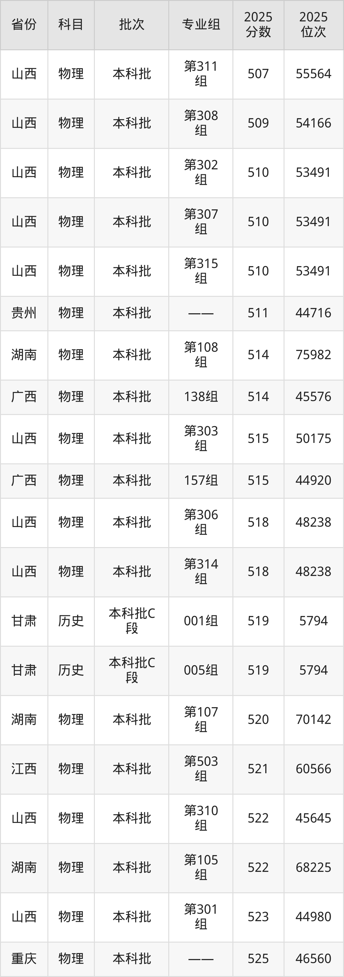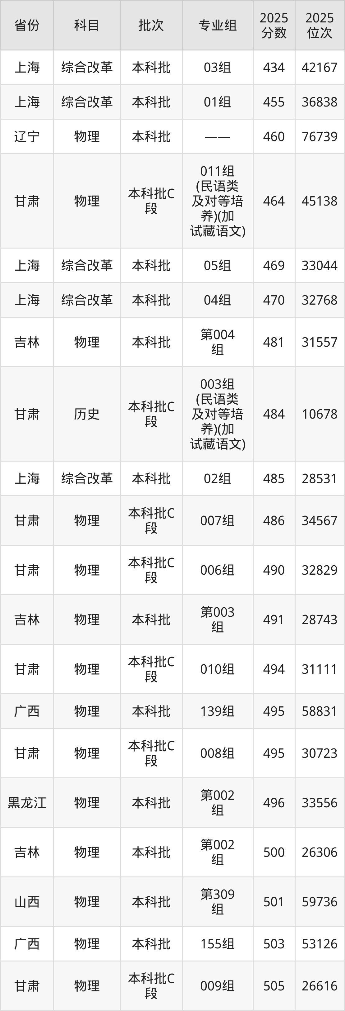 2025年西藏大学在各省普通批录取分数线一览表: