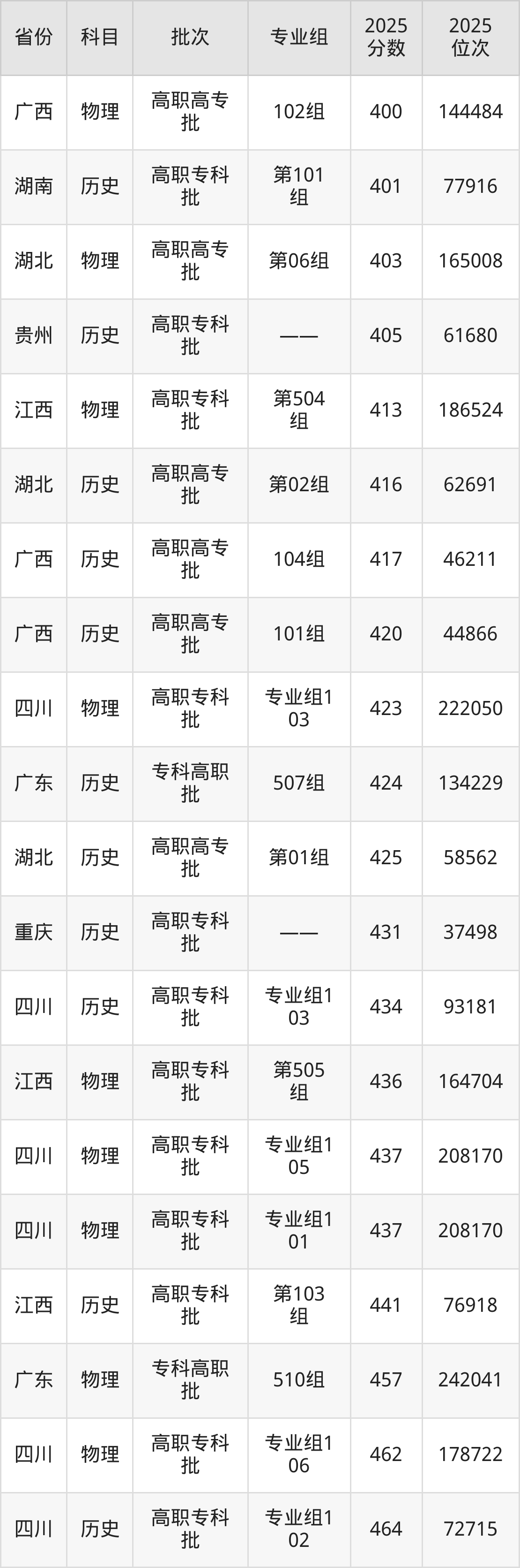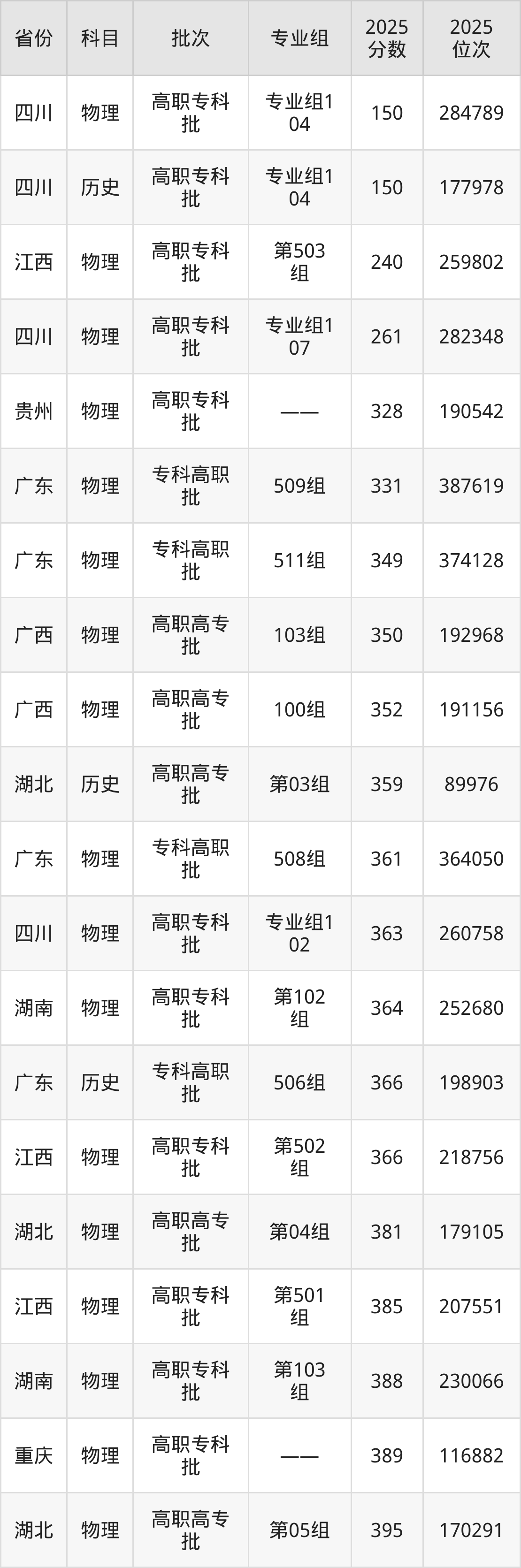 最低录取分数线是150分,对应位次是284789名,招生地区为四川;