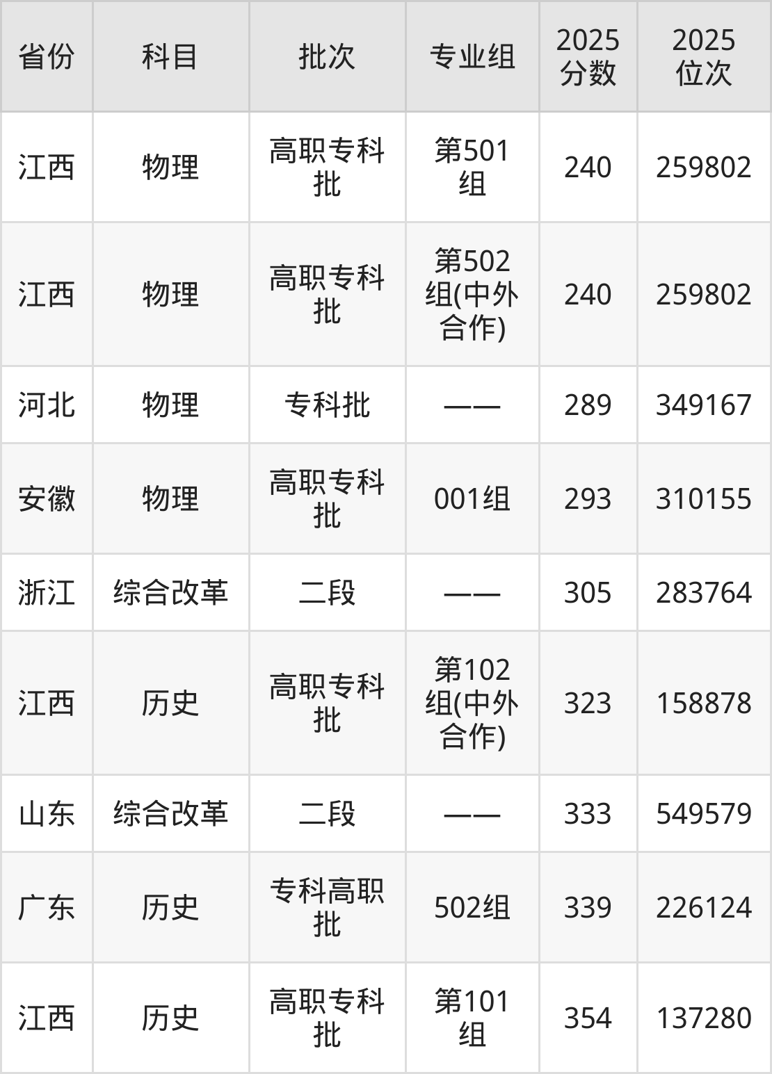 最低录取分数线是240分,对应位次是259802名,招生地区为江西;