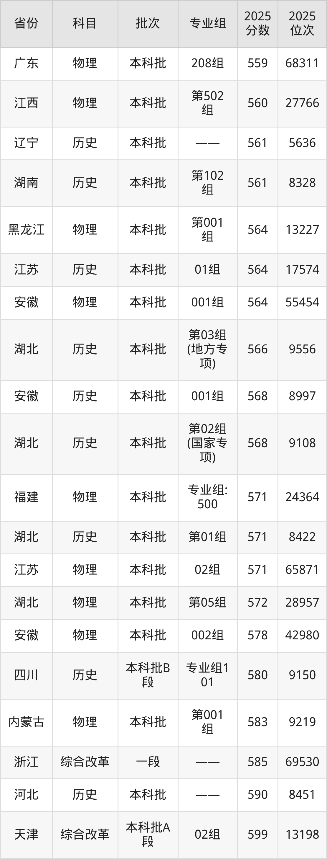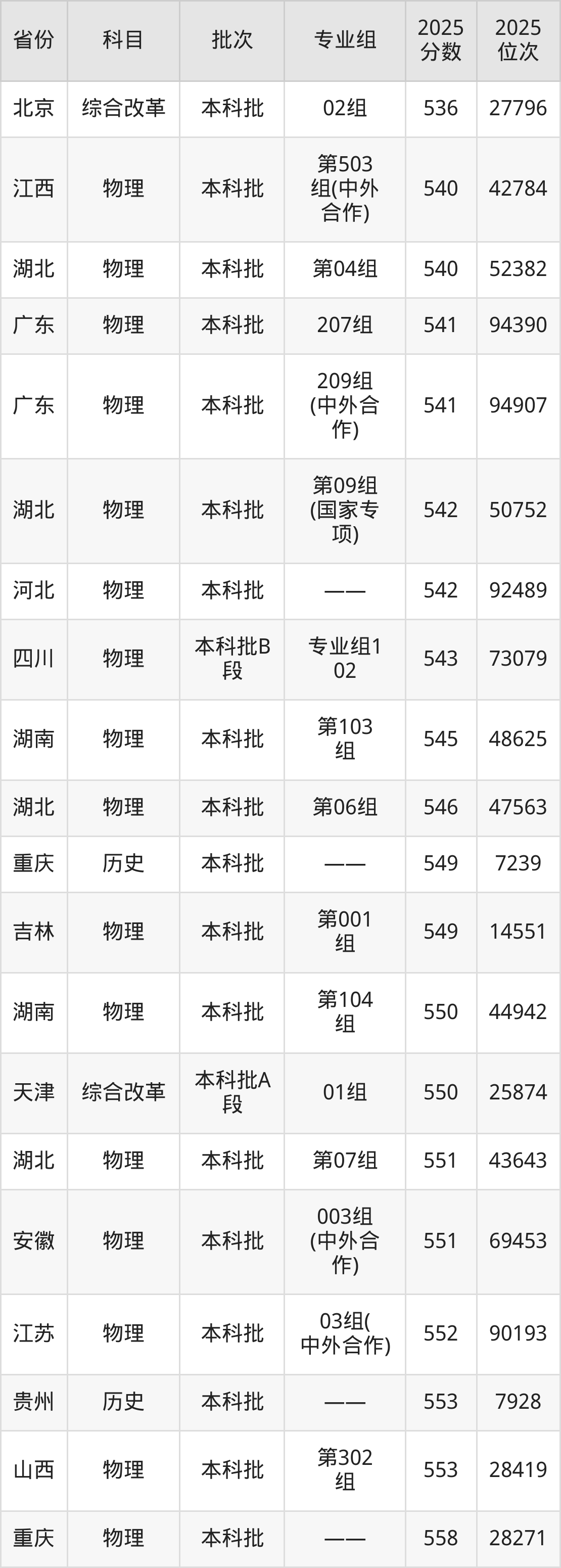 2025年武汉工程大学在各省普通批录取分数线一览表: