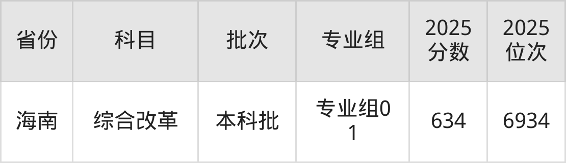 最高录取分数线是634分,对应位次是6934名,招生地区为海南。