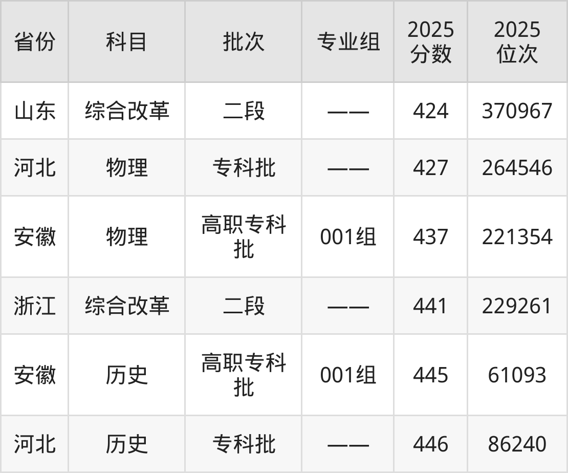 2025年安徽商贸职业技术学院在各省历史类的录取分数线位于445分-446分之间。