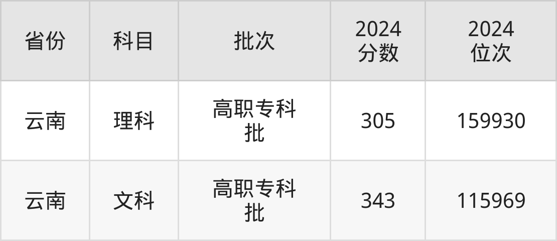 最低录取分数线是305分,对应位次是159930名,招生地区为云南。