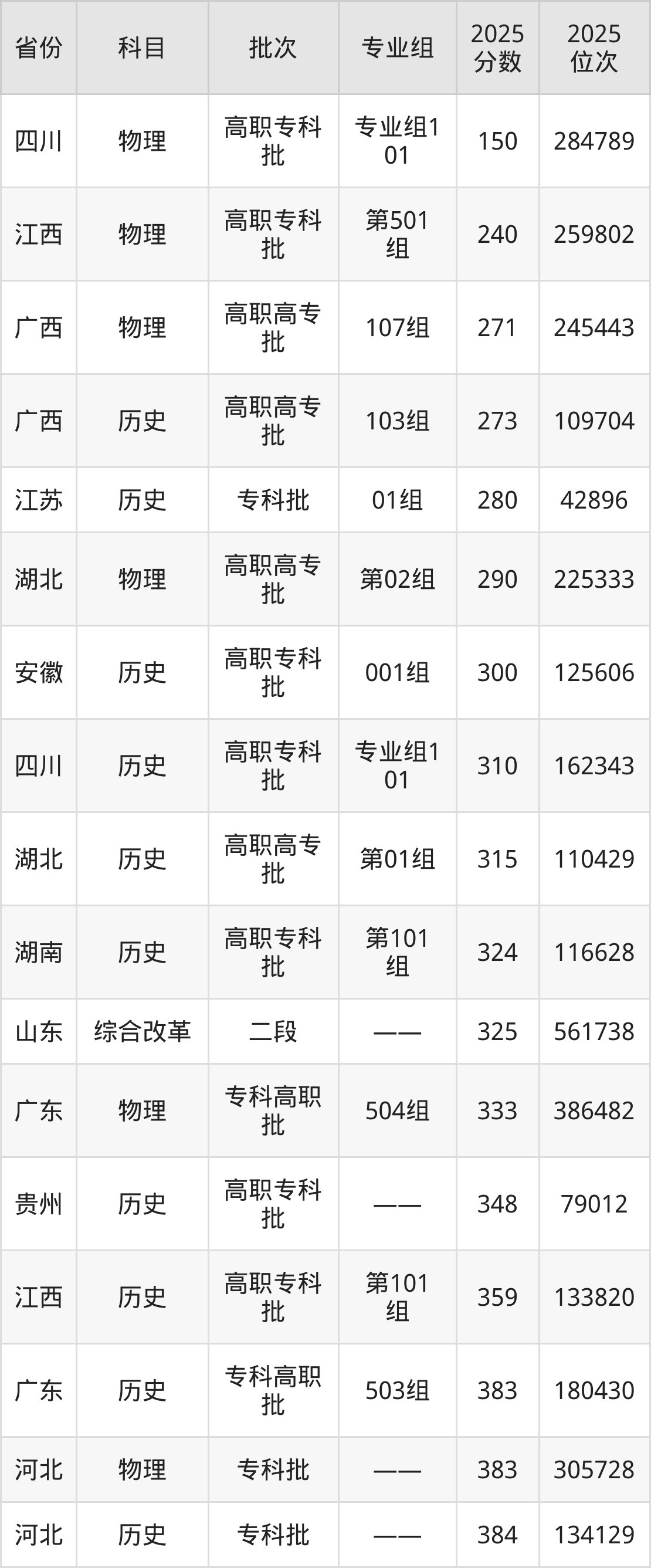 最低录取分数线是150分,对应位次是284789名,招生地区为四川;