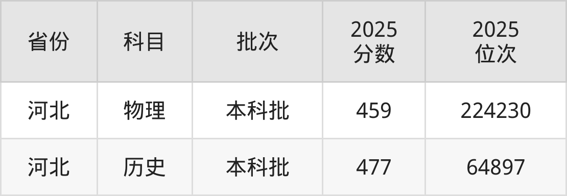 最低录取分数线是459分,对应位次是224230名,招生地区为河北。