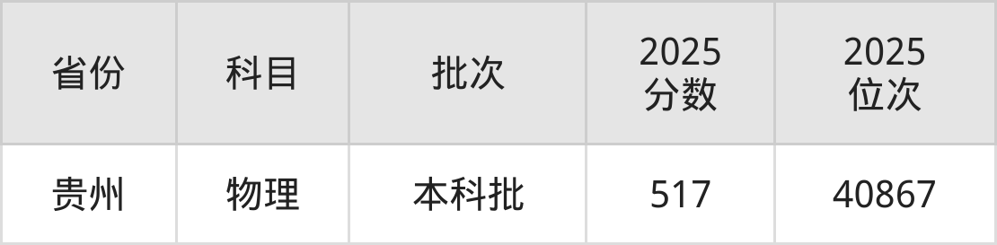 最低录取分数线是517分,对应位次是40867名,招生地区为贵州。