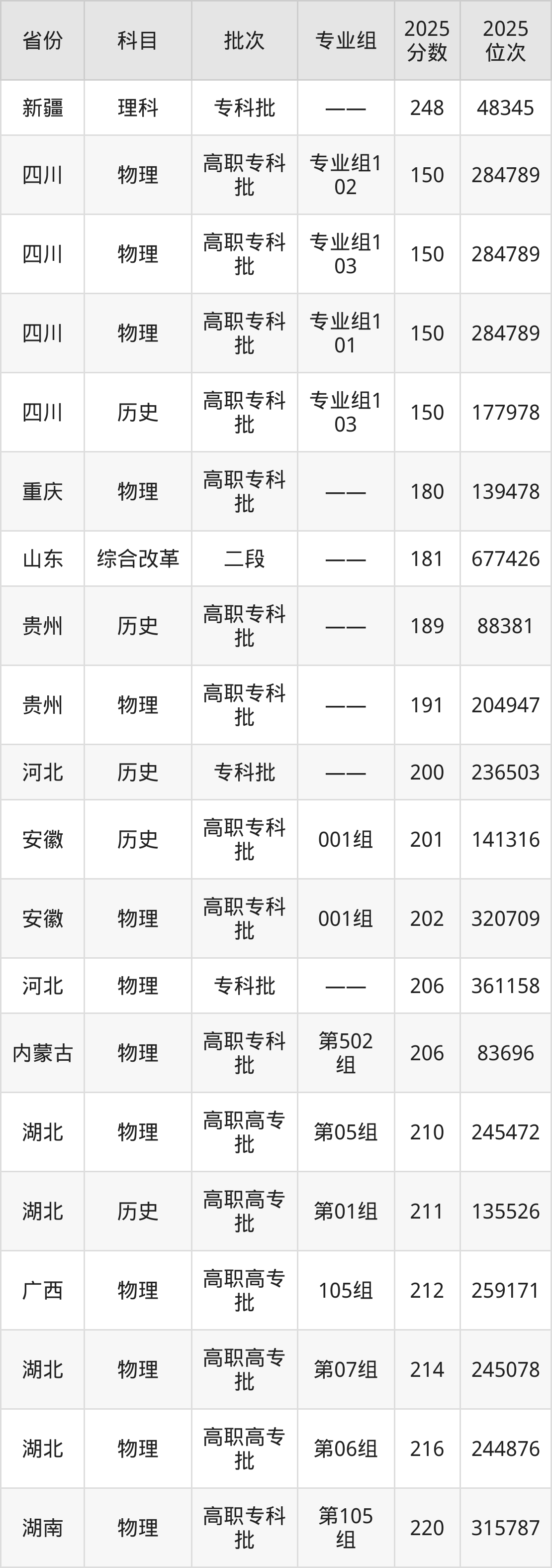 最低录取分数线是150分,对应位次是177978名,招生地区为四川;
