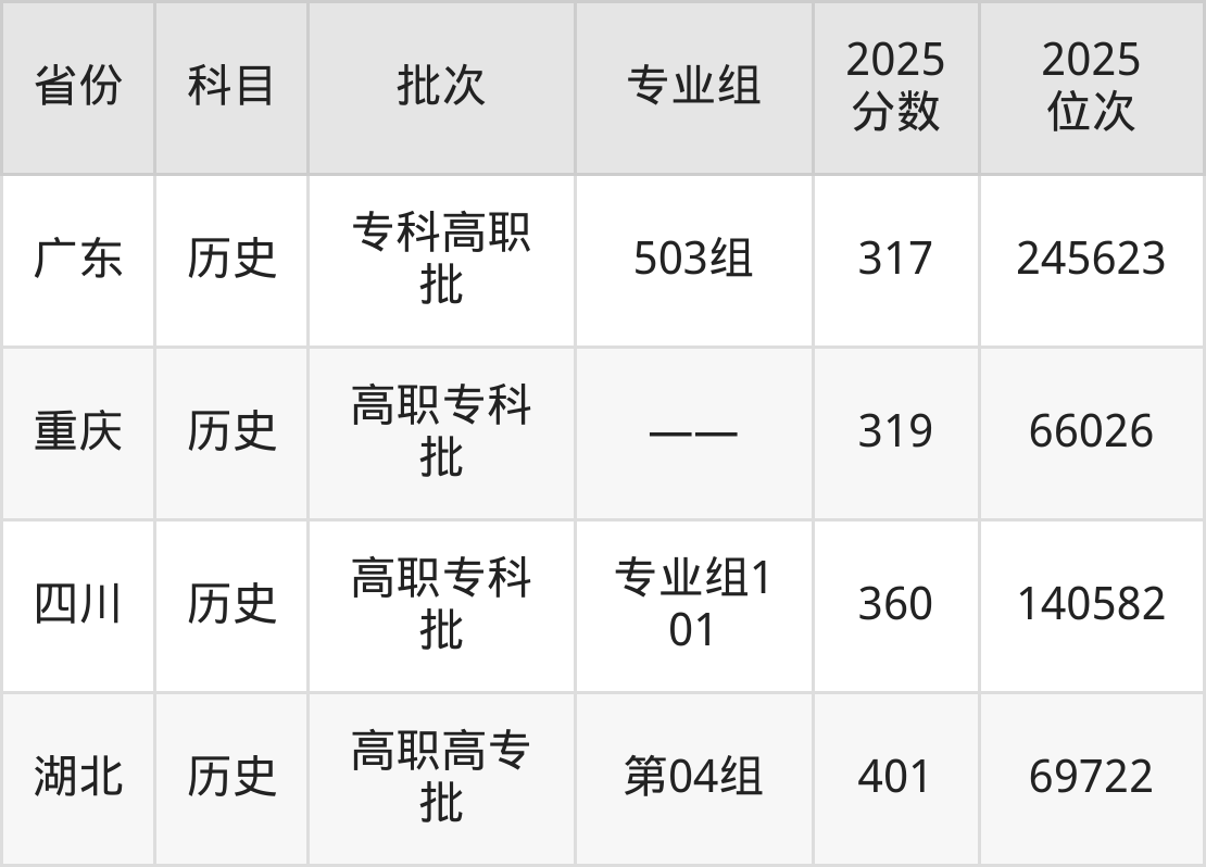 2025年贵州工商职业学院在各省历史类的录取分数线位于150分-401分之间。