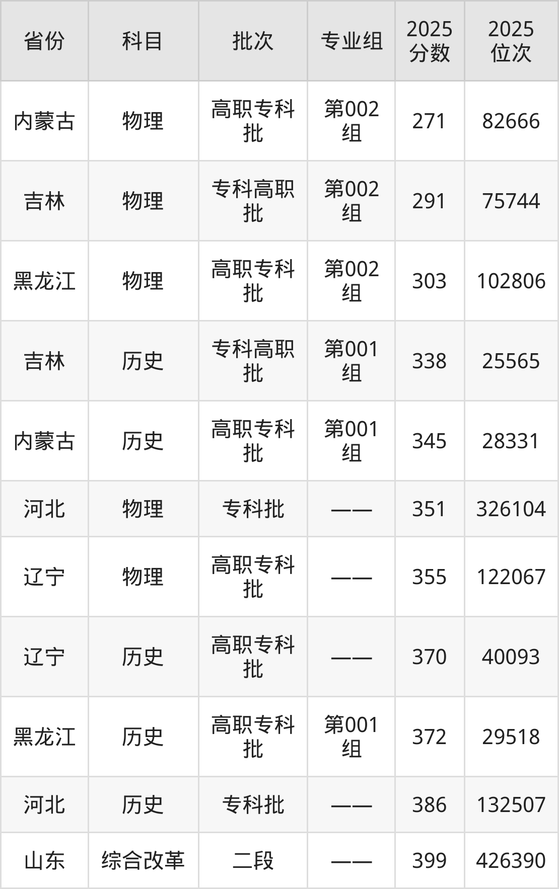 2025年吉林工程职业学院在各省普通批录取分数线一览表: