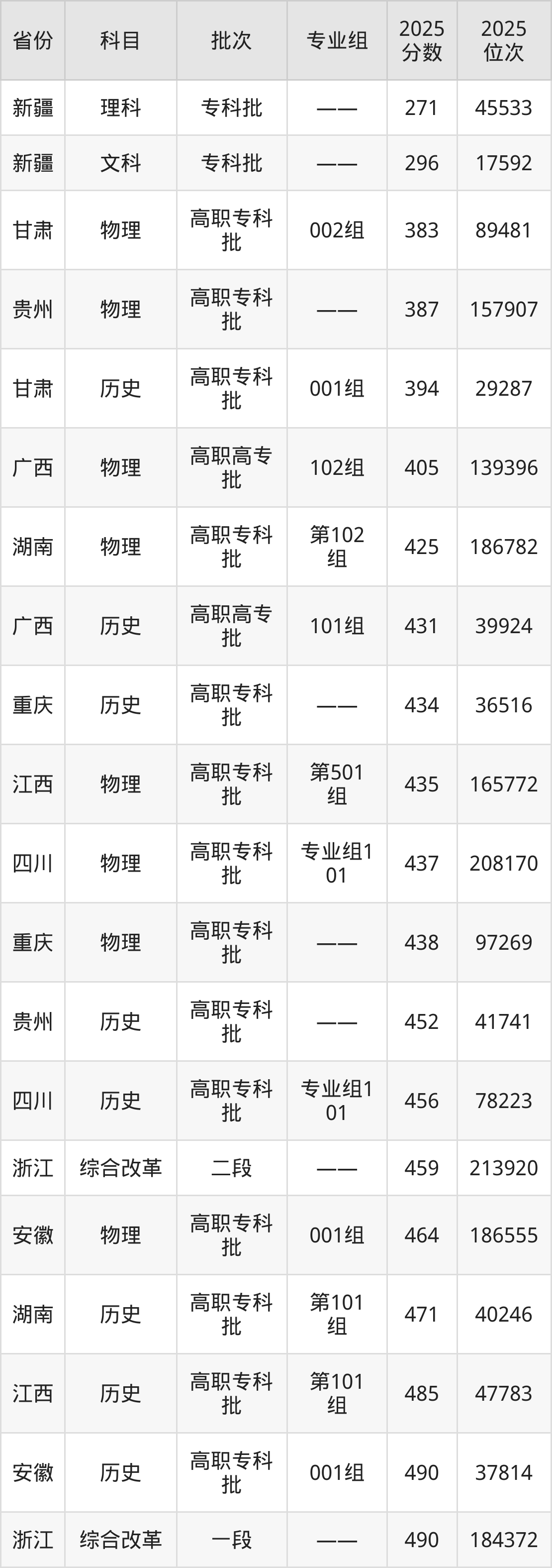 2025年浙江工贸职业技术学院在各省普通批录取分数线一览表: