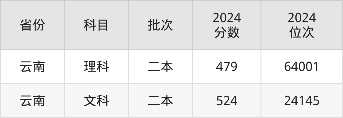 最低录取分数线是524分,对应位次是24145名,招生地区为云南。