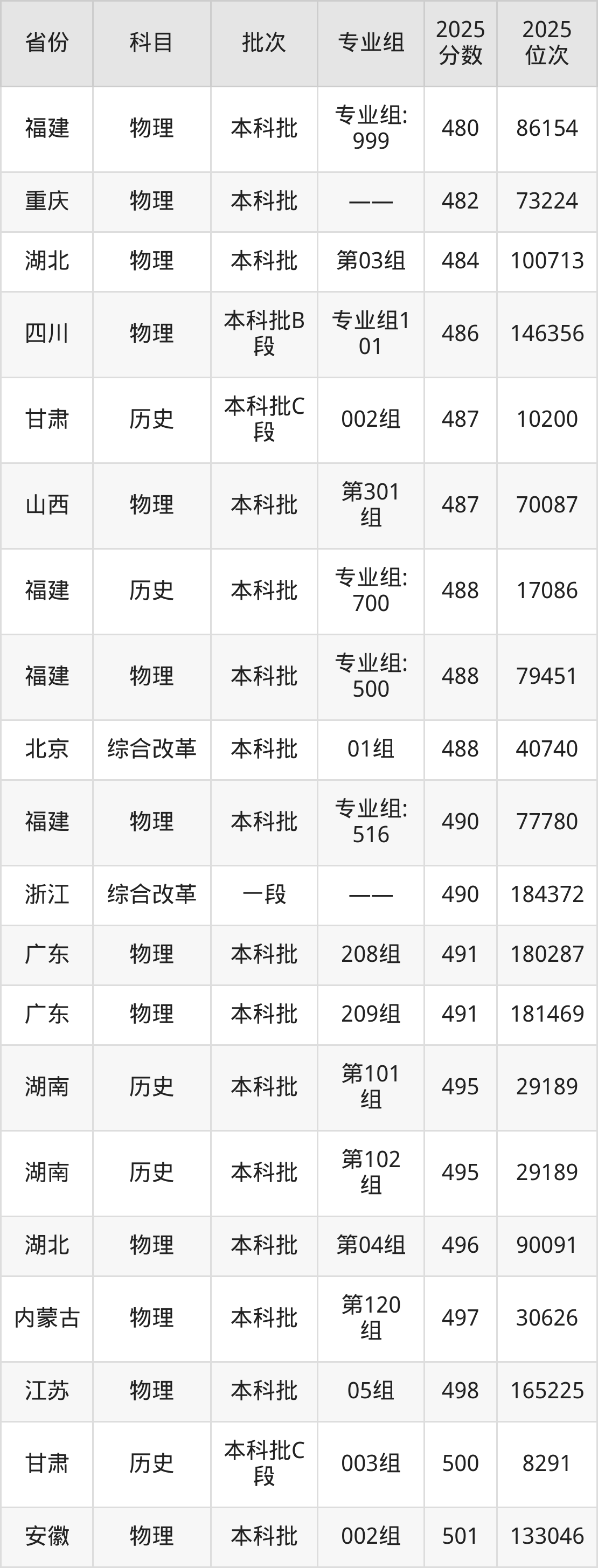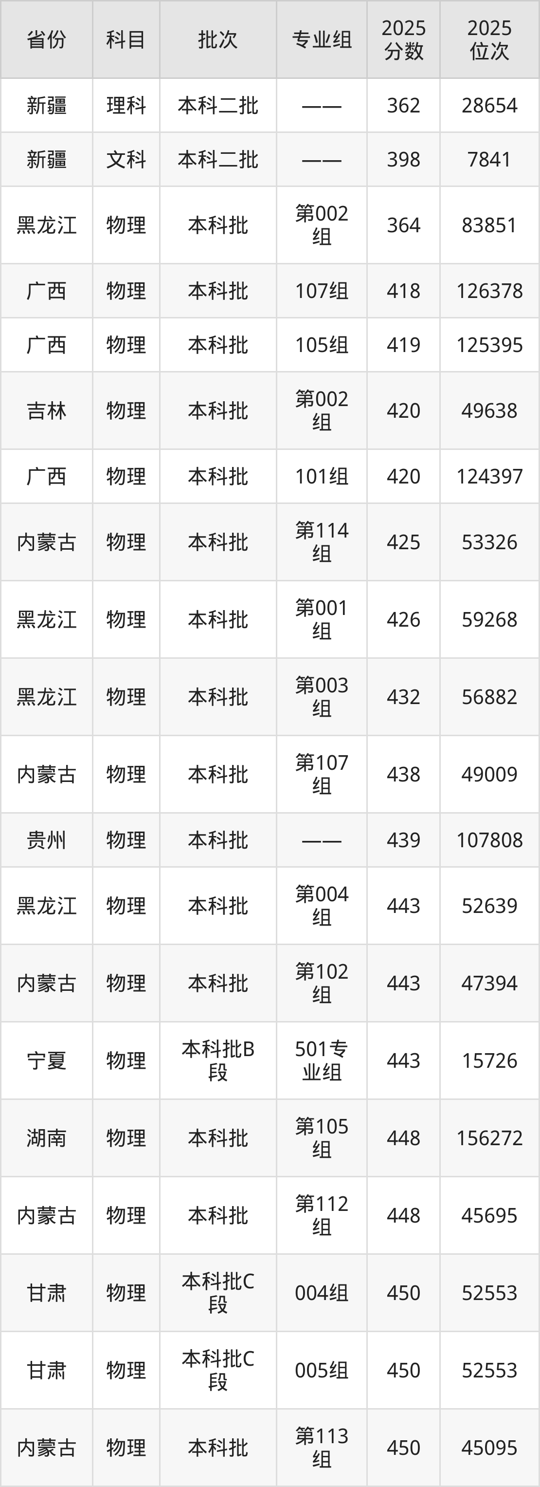 最低录取分数线是398分,对应位次是7841名,招生地区为新疆;