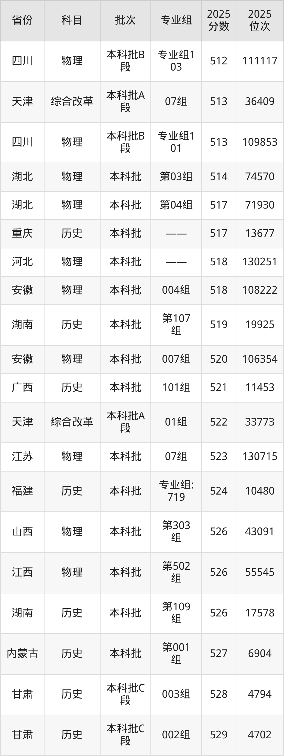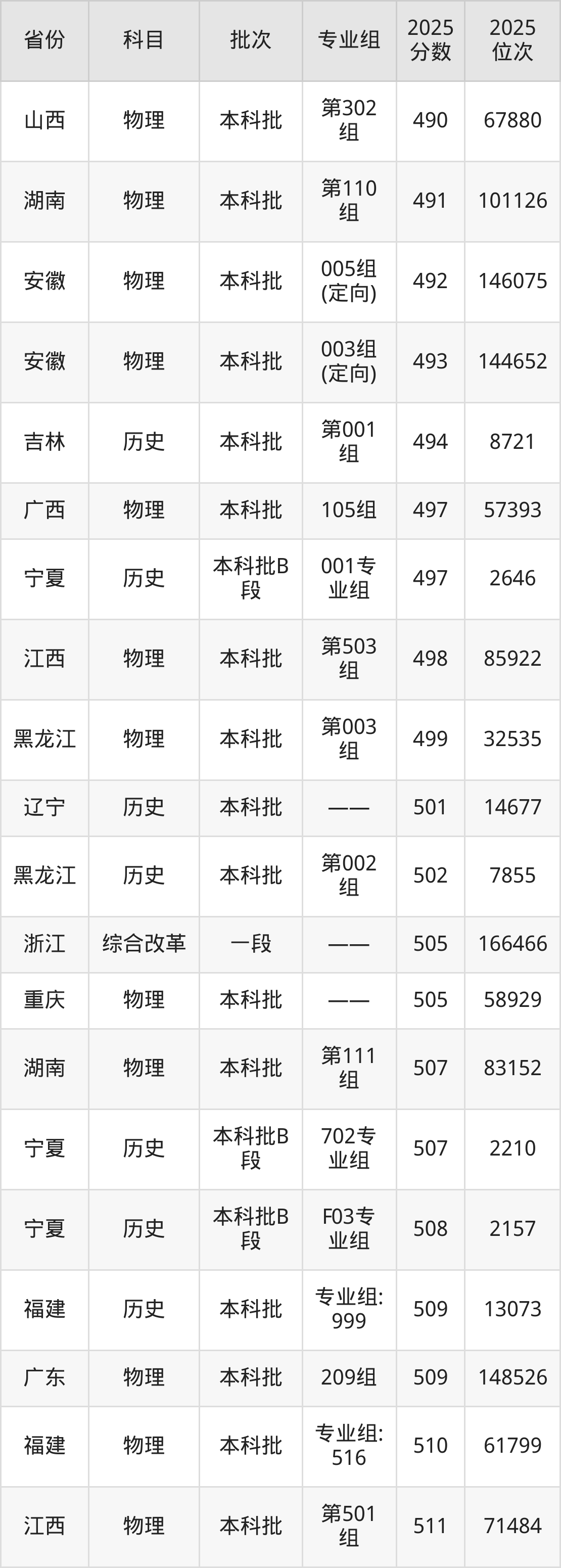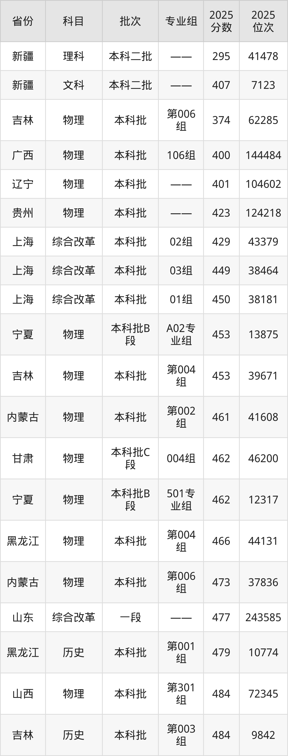 最低录取分数线是295分,对应位次是41478名,招生地区为新疆;