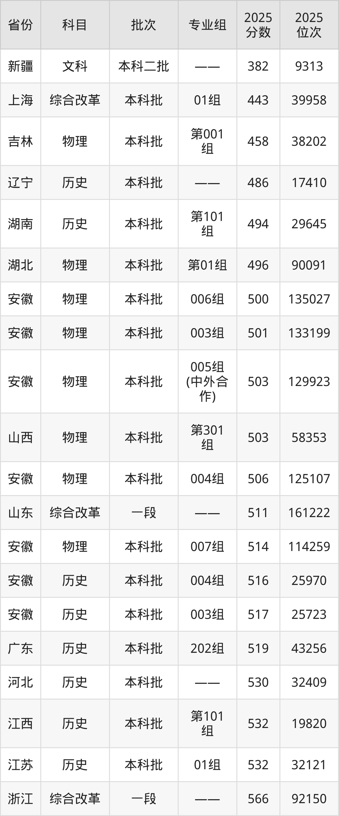 最低录取分数线是382分,对应位次是9313名,招生地区为新疆;