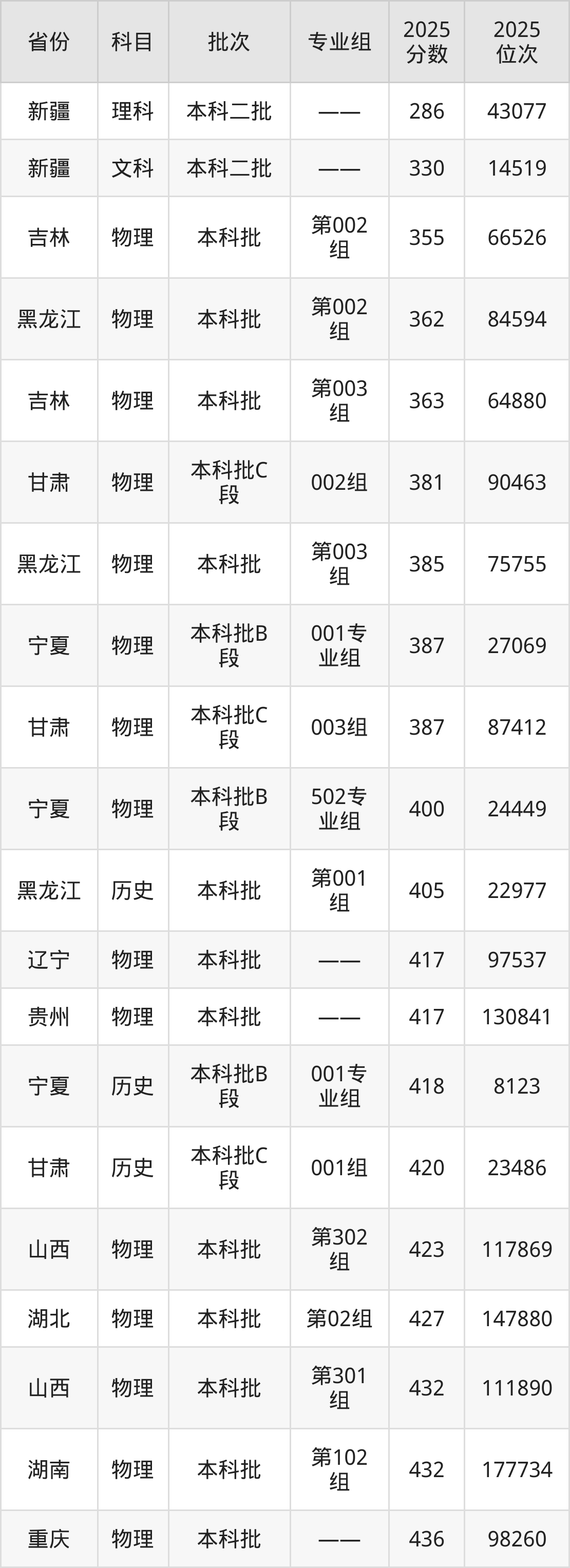 最低录取分数线是286分,对应位次是43077名,招生地区为新疆;