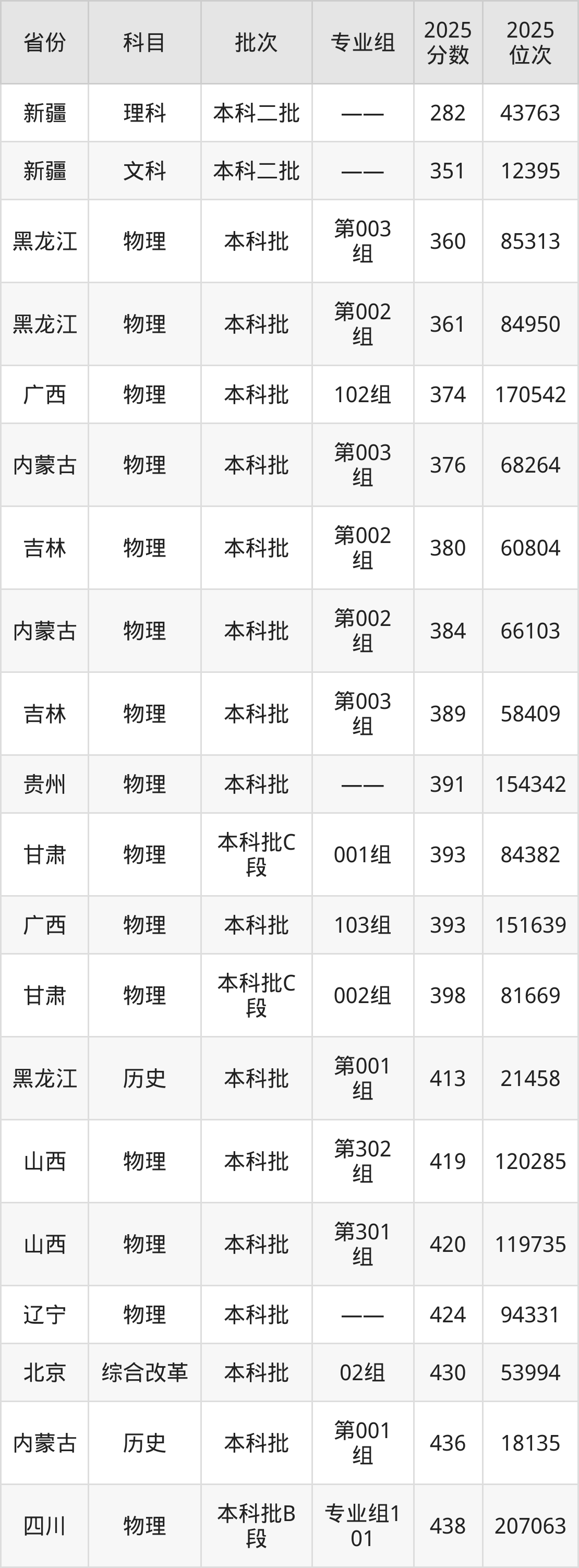 最低录取分数线是282分,对应位次是43763名,招生地区为新疆;