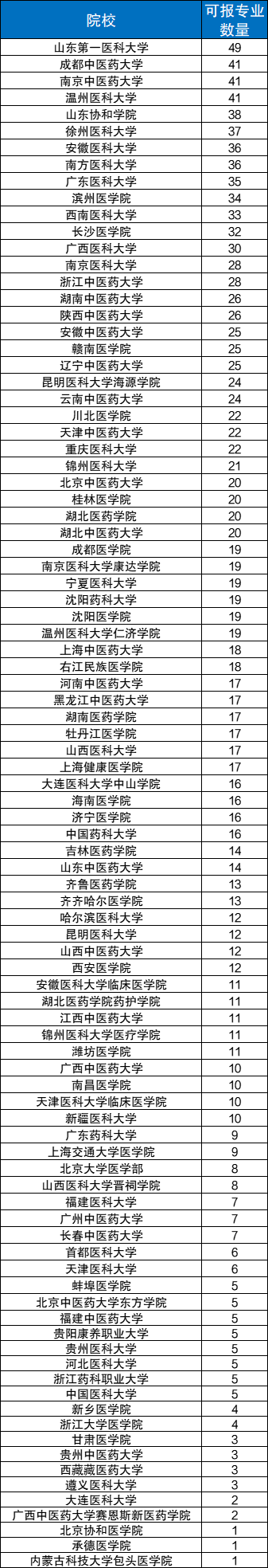 在成都中医药大学的招生专业中,物化地组合能报考的专业有41个,比如中医儿科学、医学信息工程、康复治疗学、眼视光学、药学等专业。