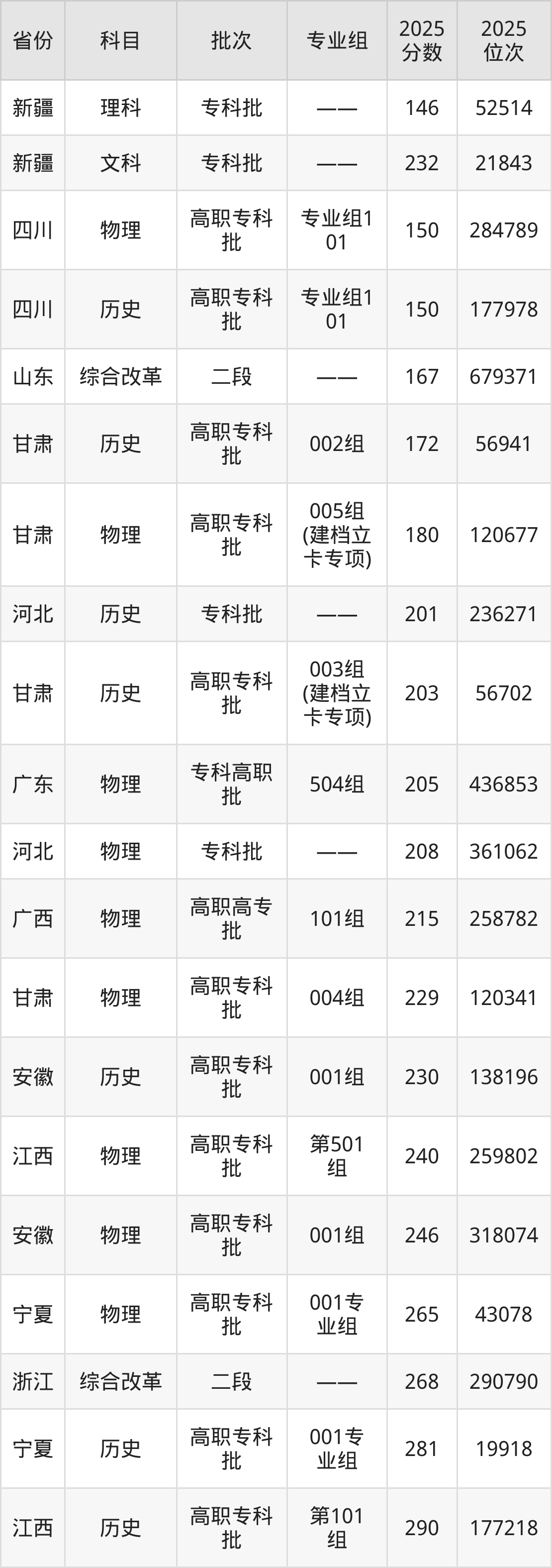 2025年白银希望职业技术学院在各省物理类和理科的录取分数线位于146分-265分之间。