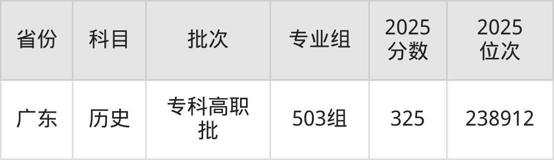 最高录取分数线是325分,对应位次是238912名,招生地区为广东。
