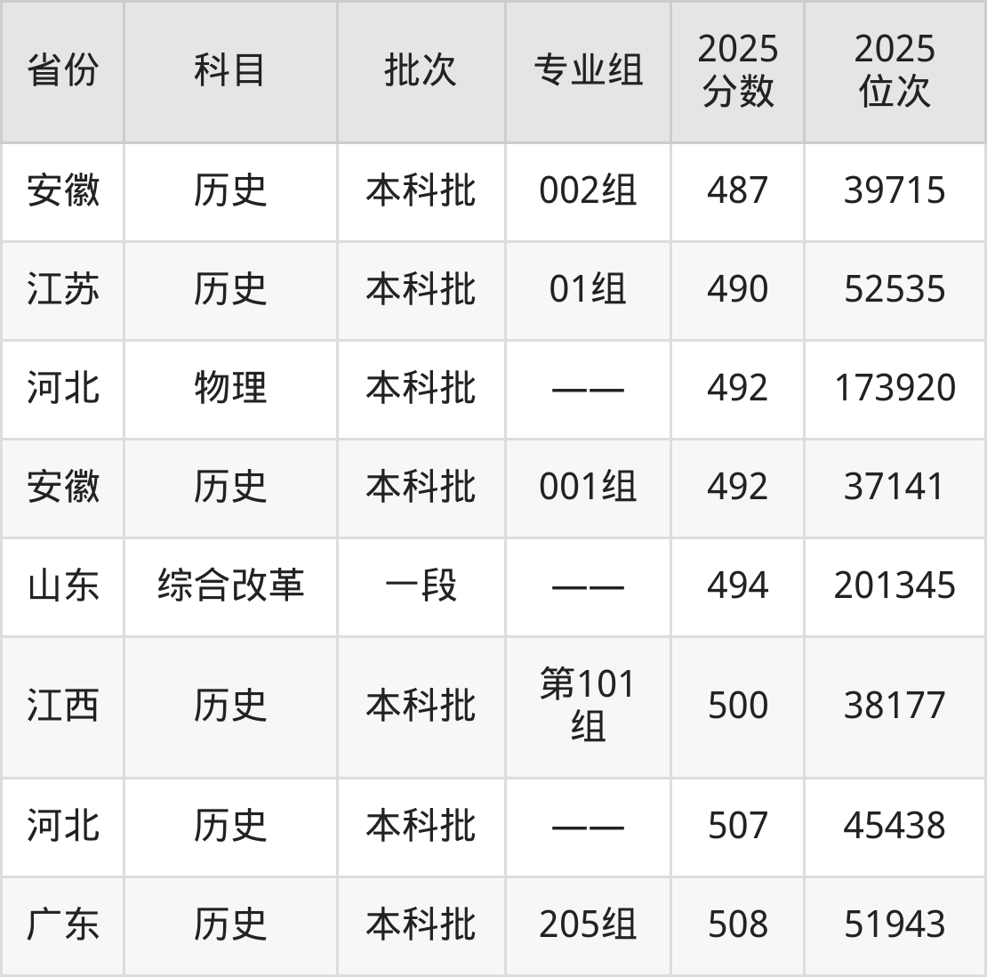 最高录取分数线是492分,对应位次是173920名,招生地区为河北。