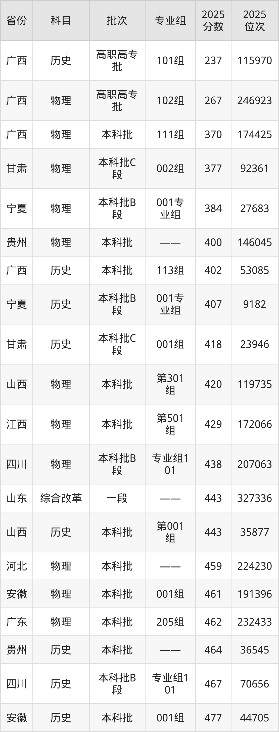 最低录取分数线是237分,对应位次是115970名,招生地区为广西;