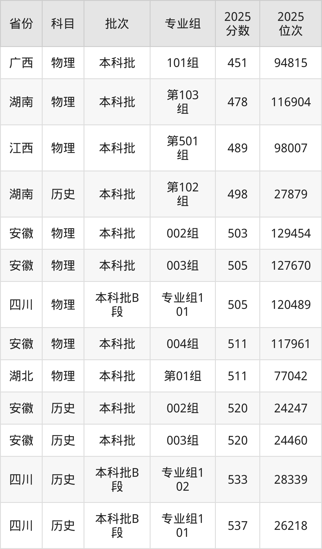 最高录取分数线是537分,对应位次是26218名,招生地区为四川。