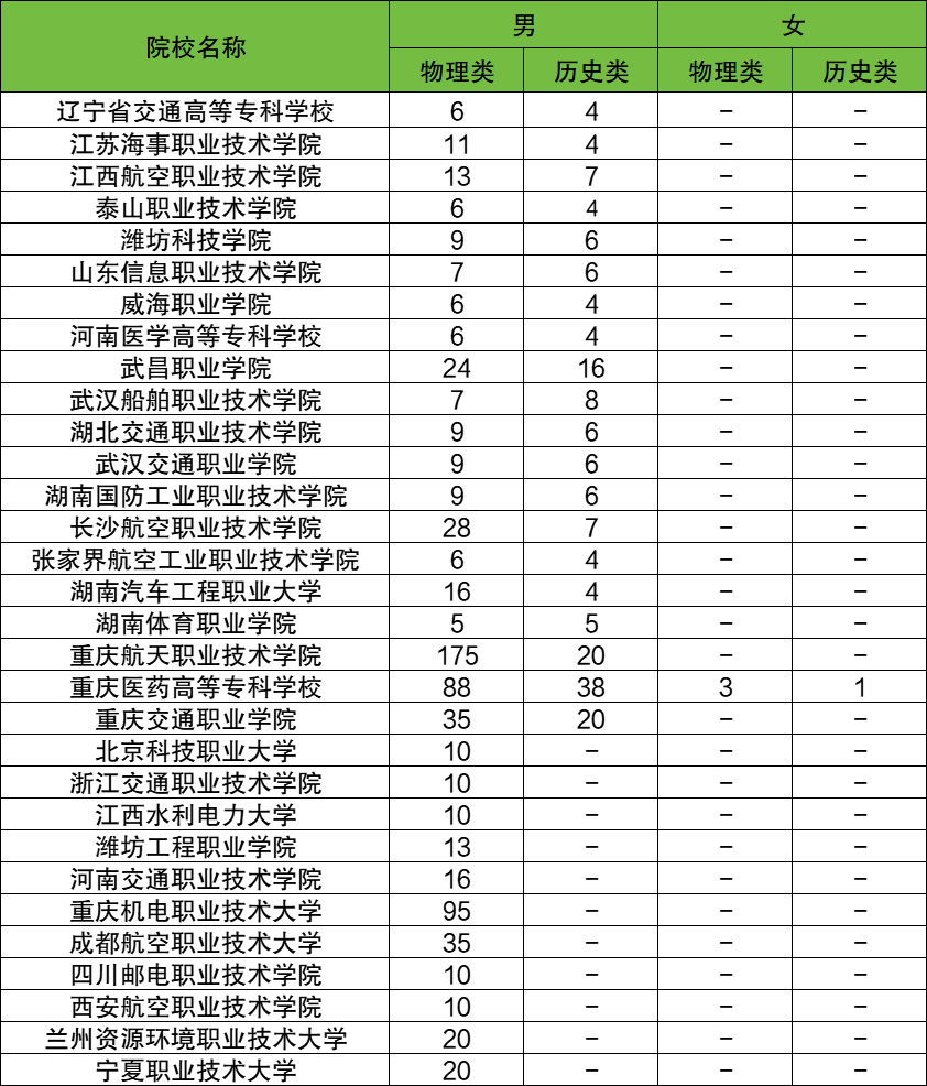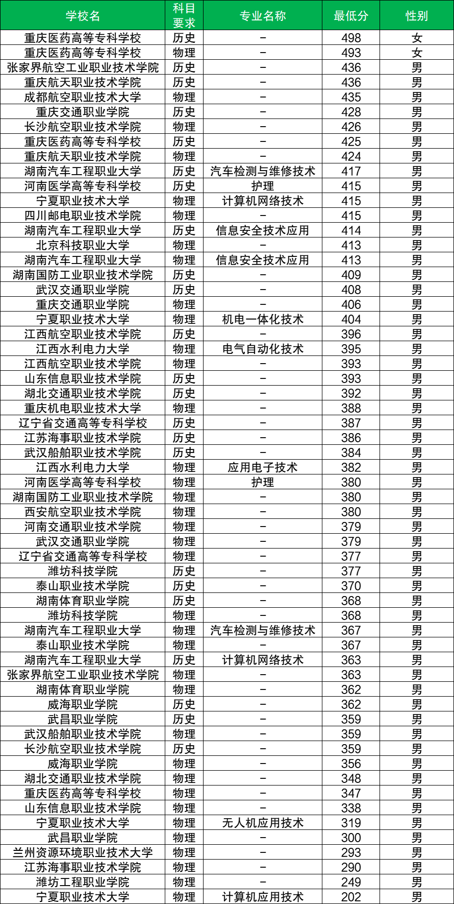 从性别角度来看,物理类女生最低需493分(重庆医药高等专科学校),比男生最低分(202分)高出291分,分数差异极大。